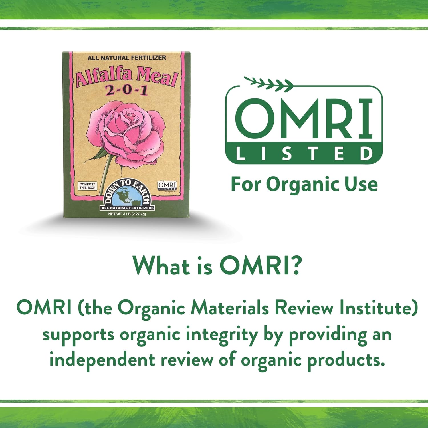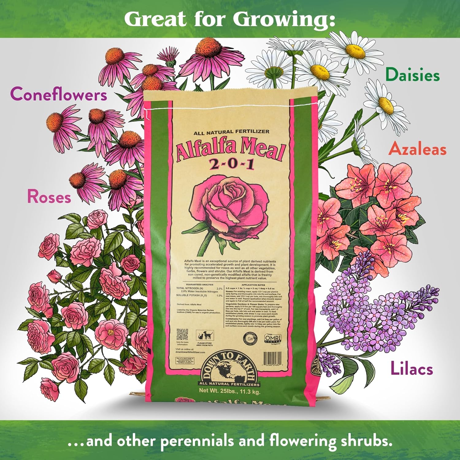Product Description Down To Earth features a complete line of natural and organic fertilizers, soil amendments, composts and potting media. They work with the microorganisms, fungi and organic matter in the soil to feed plants and stimulate growth. Our natural fertilizers are carefully blended from the best sources of organic nutrients in ideal proportions without the use of synthetics, growth stimulants or low quality fillers like poultry waste. You can be confident that you are giving your farm or garden the best product available, whether it’s a multi-purpose blend or a specialized soil amendment. From the Manufacturer A great source of trace elements for fertilizing and soil conditioning, Alfalfa Meal is loved by roses and earthworms alike. Works very well as a compost bio-activator due to its remarkable nitrogen to carbon ratio and also makes a great mulch for use in the planting and growing stages of your plant's life.
