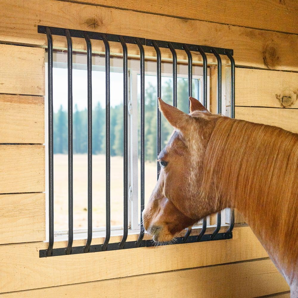 Enhance your horse stall safety and upgrade your barn with Schneiders Easy-Up Pro Bar Panels for 4'x4' Windows. Designed for superior strength and safety, these panels feature heavy-duty 3/4" diameter steel tubing with a 1.2mm gauge that stands up to daily barn use. The 2.5" bar spacing provides maximum security while allowing airflow and light, keeping your horse comfortable and visible. Each panel mounts 2" above the window wall for added clearance, preventing rubbing or entanglement. Easy to install with the included mounting screws, these panels fit standard 4'x4' windows perfectly. The galvanized and black armor finish protects against rust and corrosion, ensuring durability and a sleek appearance that enhances your equestrian setup. Measuring 50" L x 50" T total (two panels), they offer both form and function for your barn, farm, or equine facility. Backed by a 7-year warranty, Schneiders Easy-Up Pro Bar Panels deliver dependable performance and peace of mind for horse owners who value safety and quality. Perfect for any equestrian environment, these panels combine long-lasting construction with professional design to create a secure, well-ventilated stall space your horse deserves.
