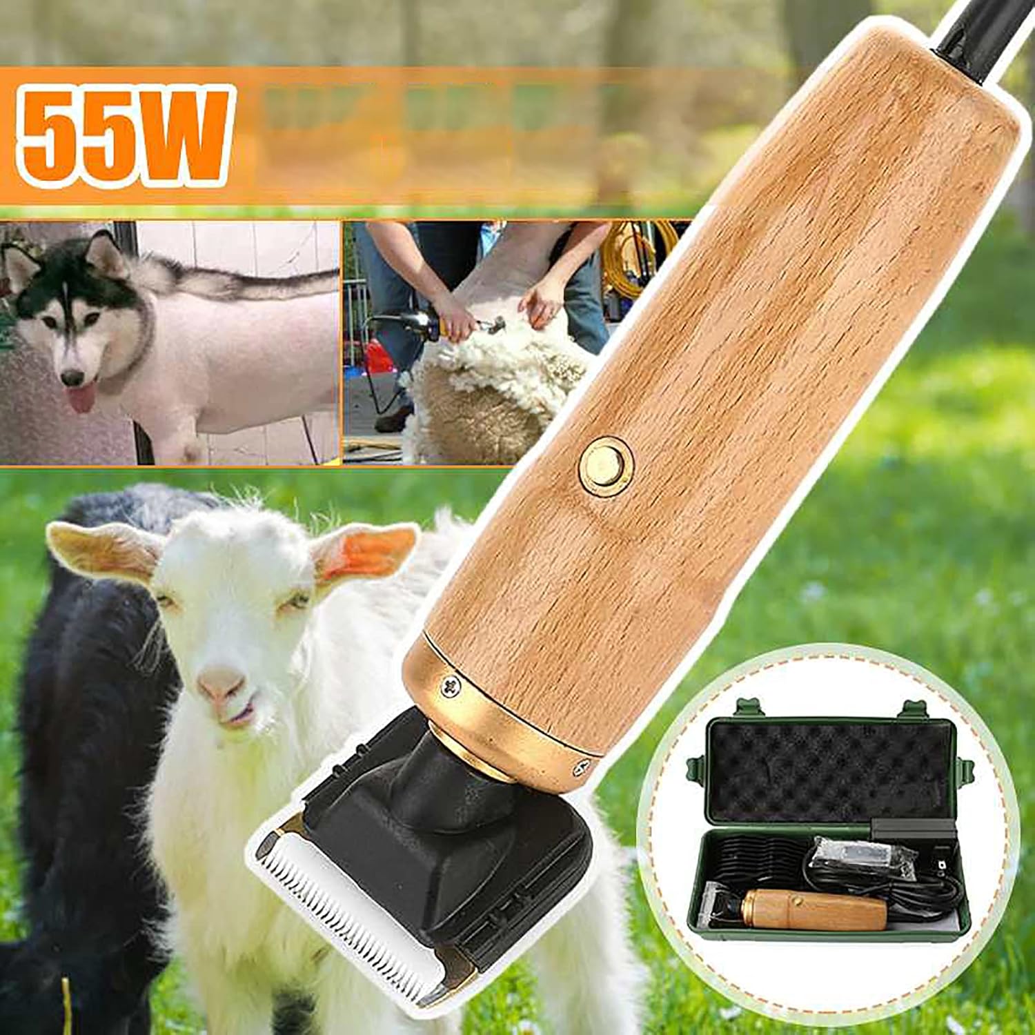 DESCRIPTIONIf you are searching for a perfect set of shears then our heavy-duty electric clippers will be your best choice. This professional sheep, large dogs, and farm livestock grooming clippers make shearing simple and effortless.SPECIFICATION:Type: Electric Wool ShearsColor: Red/Wood colorShell Material: WoodMaximum power: 55WRotating Speed: 6000RPMVoltage: AC110-240V, 50/60HZSize: 160*38mm Product features: fast shearingApplication: Shearing machine can be used to trim the hair of sheep, cows, dogs, horses, and other animals NOTE:1. Please allow 0.5-1cm differences due to manual measurement.2. Due to the light and screen difference, the item's color may be slightly different from the pictures.