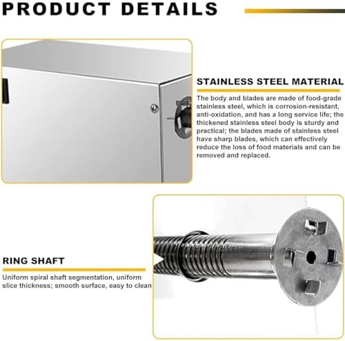 The electric potato tower machine is a stainless steel device designed to effortlessly rotate potatoes into spiral towers. This commercial spiral potato cutter is ideal for parties or small businesses and features non-slip silicone feet for stable operation. The slice thickness is adjustable between 2.5-3 mm, allowing for the creation of delicious and crispy tornado potato chips. It includes a three-speed control switch with forward, backward, and stop options for ease of use. This automatic potato tower is essential for any kitchen or restaurant. Specifications: Model: Electric potato tower machine, Power: 60W, Speed: 90 rpm, Cutting thickness: about 1/8 inch spiral, Material: Stainless steel, Slice thickness: 2.5-3mm, Speed: 10s forming, Dimensions: 46×15×19.5cm, Net weight: 4.8kg. To use, pass a bamboo stick through fresh potatoes, insert it into the machine, and secure the potato with a four-pin fixed shaft. Then, press the start switch to begin slicing. Each slice will be approximately 2.5-3mm thick, perfect for a crispy and delicious snack.