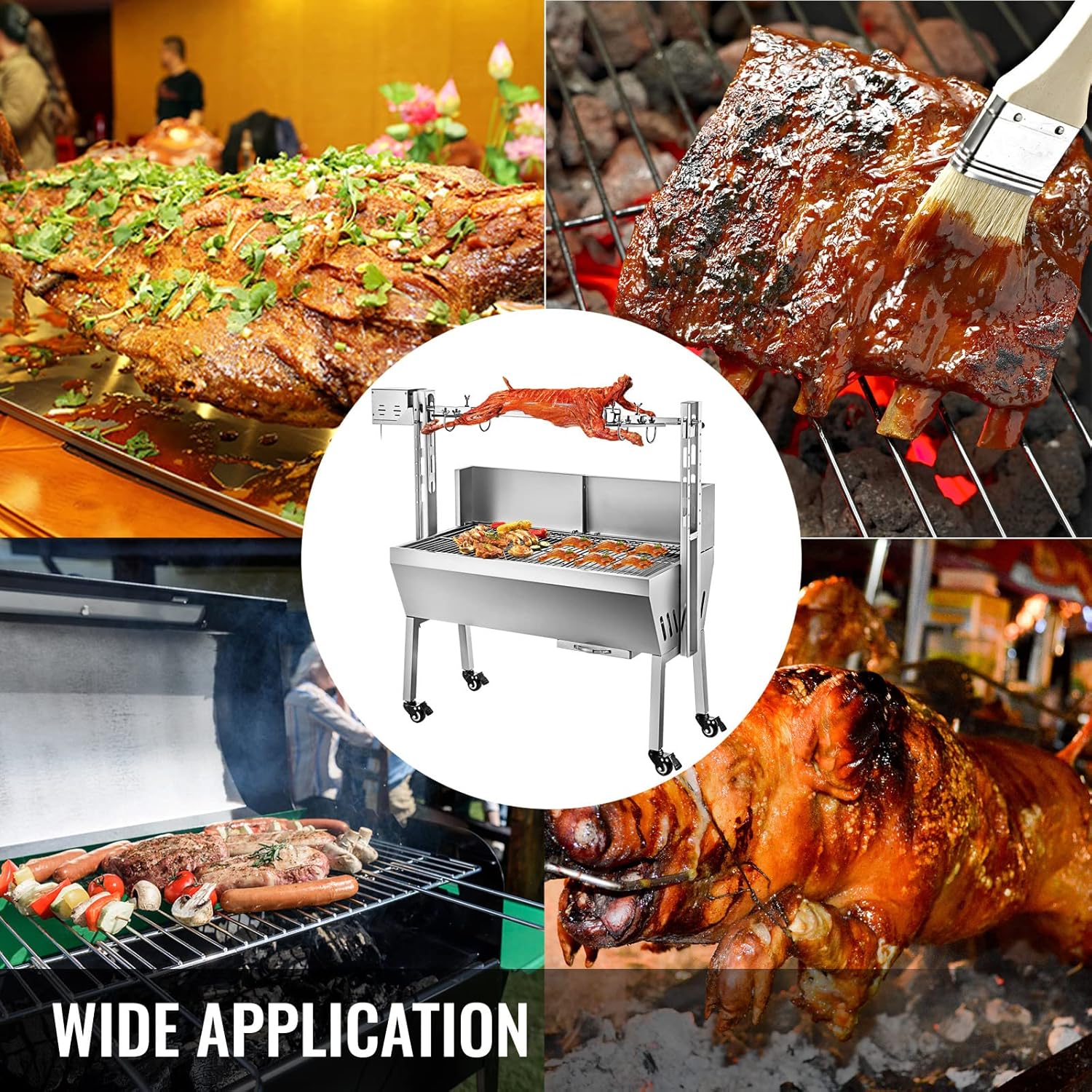 Feature: High temperature powder coating, high temperature resistance. 3 chrome-plated grilles with adjustable grille height. 14/25W powerful motor, stainless steel structure, solid and durable. No frost, easy to clean, rust-proof. Save fuel and prevent heavy smoke. Grill a lot of meat at once. Product Description: Voltage: 110V (60HZ)/220V (50HZ) Power: 14W/25W Material: Stainless steel. BBQ: 3 chrome grills. Cooking surface: 985 x 400mm Load capacity: 40/60KG Style: Steel firebox construction Length (including spit): 1060mm/42in Height (including tripod): 800mm/32" Roasting furnace body size: L: 890mm (about 35 inches), W: 450mm (about 17.5 inches), H: 250mm (about 10 inches) It is best to maintain the service life of the bearing at about 70%. During preheating, the motor should run for 2 minutes at any load (add food after 2 to 3 minutes) Application: Roast whole lamb and other animal meats, portions can be added to the frame of the lamb rack Warn: This product is only suitable for charcoal briquettes, lump charcoal or wood.