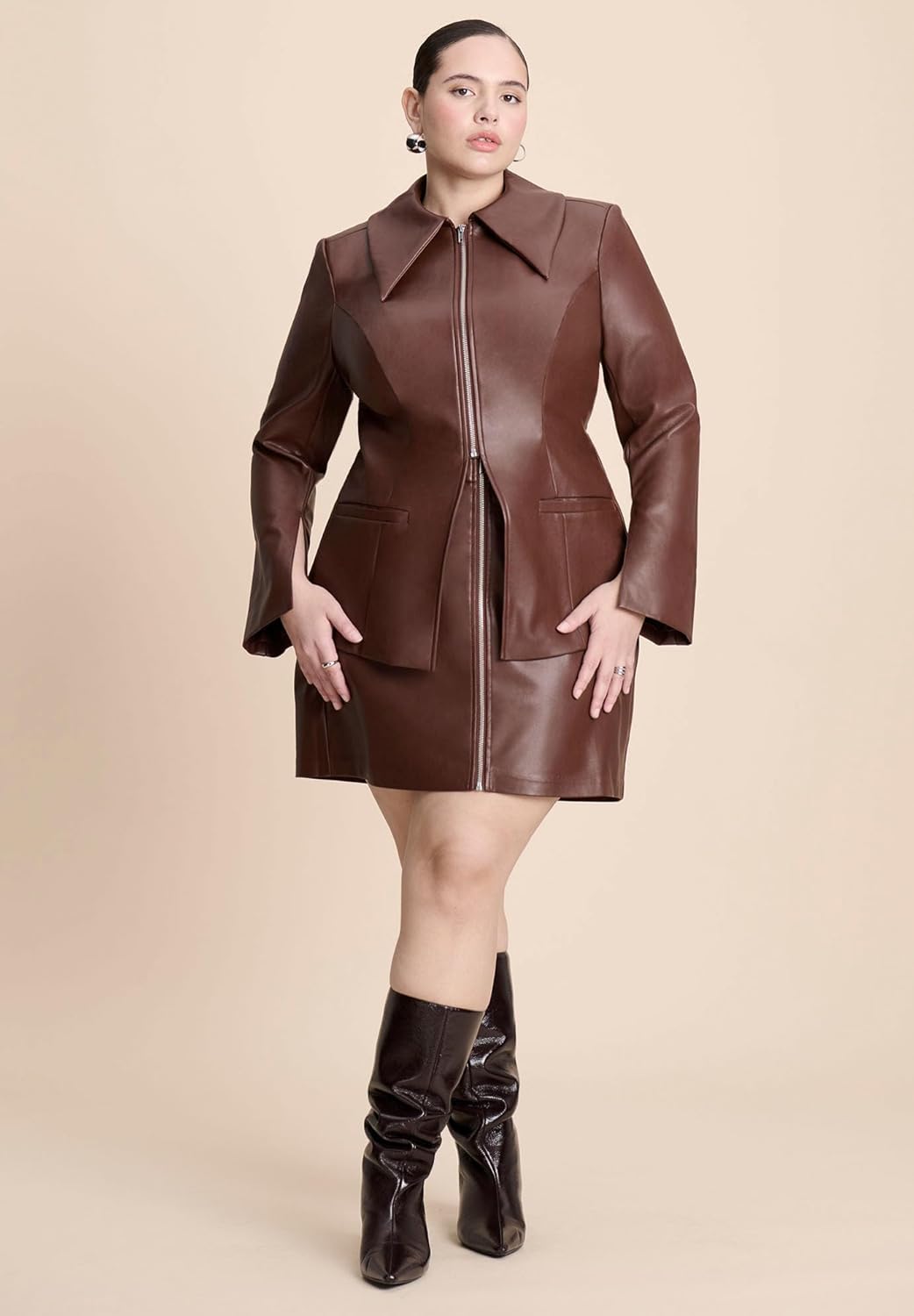 Step into sleek confidence with this faux leather mini skirt designed for sharp, modern impact. A close fit, statement front zipper, and smooth finish create a bold yet versatile silhouette.Shell: 100% Viscose, Coating: 100% PU br> Close fit br> Unlined br> Front zipper br> Slant pockets br> Mini length br> 19" skirt length on size 18 br> Non-stretch faux leather br> Hand wash cold with like colors. Spot clean as needed. Do not dry clean. Do not tumble dry. Do not twist or wring. Lay flat to dry. Do not iron.