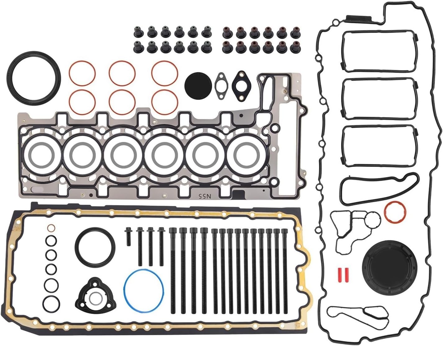 Replace Part Number:11127599212, 11 12 7 599 21211127587804, 11 12 7 587 80411137600482, 11 13 7 600 48211340032582, 11 34 0 032 58211428637820, 11 42 8 637 820021000203, 11340035853, 11427525335, 11427537293, 11340034068, 11617547242, 11617588624Fitment:Fits the following vehicles with N55B30 (3.0L ) Engine:2 (F22 F23) Series3 (E90 E91 E92 E93 F30 F31 F34) Series4 (F32 F33 F36) Series5 (F07 F10 F11) Series6 (F06 F12 F13) Series7 (F01) SeriesX1 (E84) SeriesX3 (F25) SeriesX4 (F26) SeriesX5 (F15) SeriesX6 (E71) SeriesSpecifications:Main Material: Durable MaterialMain Component: Metal, Multi-Layer Steel (MLS), RubberCylinder Bore: 85mmFitment Type: Direct ReplacementPlacement: Engine CompartmentPackage Includes:1x Full Engine Gasket Overhaul Kit (Includes: MLS Gasket, Valve Cover Gasket, Valve Stem Seals, Small Gaskets & O-Rings)1x Cylinder Bolts Set