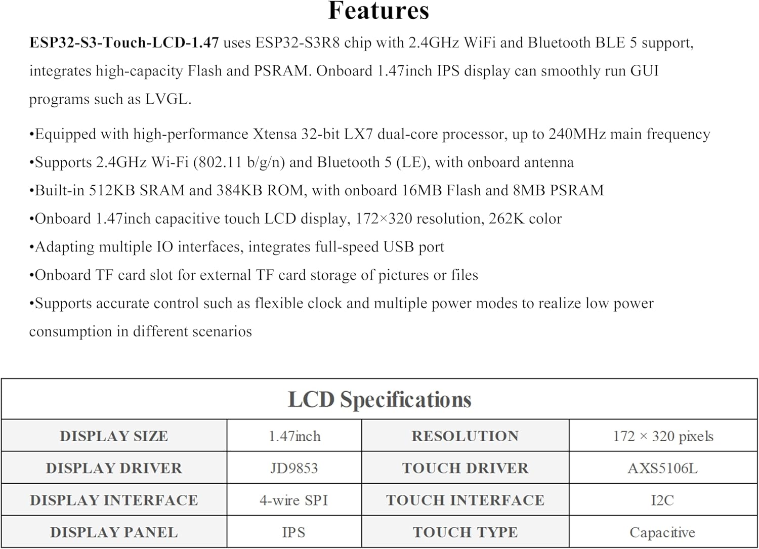 | BuiltIn Media | ESP32-S3-Touch-LCD-1.47 with pre-soldered header x 1 |