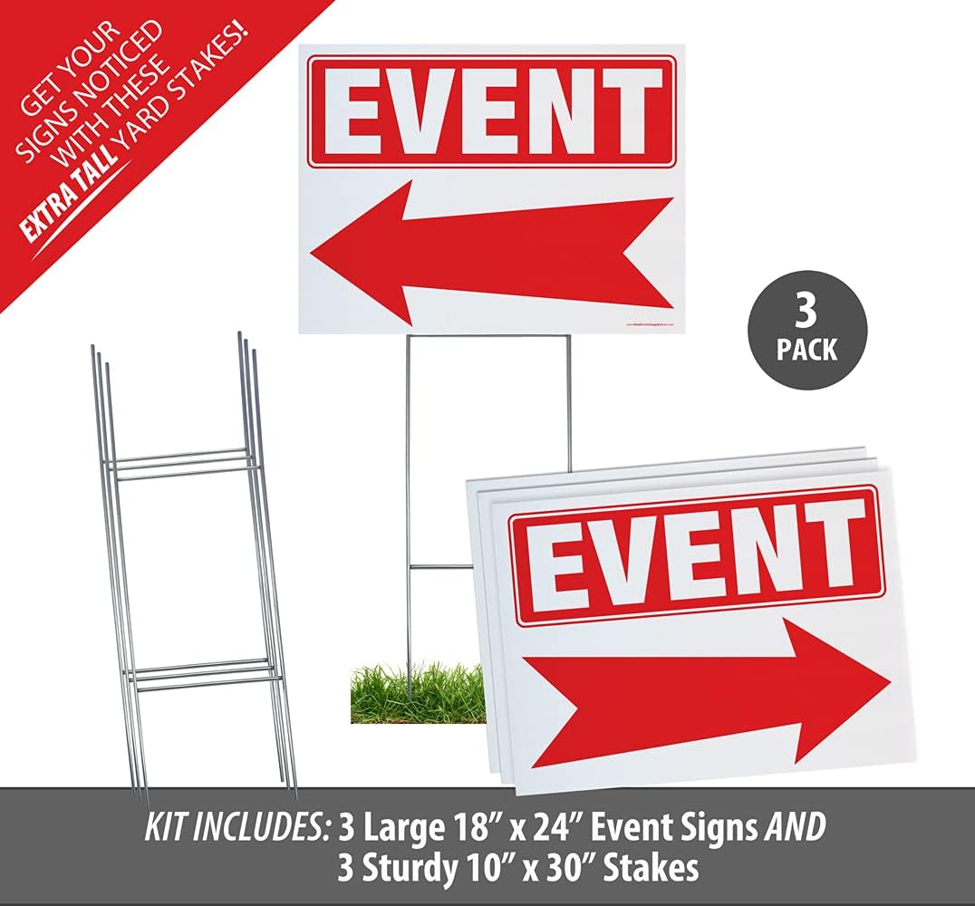 ★ CLEAR & EASY TO READ This large sign is made to stand out and grab attention of your guest. The easy to read font and directional arrow will keep directions clear and precise, easing the mind of both the guest and the host. ★ BE SEEN - LARGE SIGN AND TALL STAKES WILL GET NOTICED Our signs are a FULL 18” x 24” and printed on BOTH SIDES. The extra-large sign stakes are 10” wide x 30” tall and are designed to hold on to your sign stronger and stand up taller. ★ DURABLE, ALL-WEATHER SIGNS AND STAKES Printed BOTH SIDES with FADE RESISTANT UV Ink on 4mm Corrugated Coroplast - these directional signs are extremely durable in ALL weather conditions. The 10x30 9GA GALVANIZED STEEL sign stakes are Heavy Duty, Rust Resistant and are taller &wider than most so they will hold tighter to your sign, stay in the ground and stand taller. ★ QUICK and EASY WAY TO DIRECT YOUR GUESTS Our directional outdoor yard signs can be installed quickly and easily. Simply slide the sign onto the heavy-duty Double H Step Stake, place it in the location you want then step down on the bottom rung of the stake to insert it into the ground! Such an easy way to direct guests. ★ SIGNAGE FOR EITHER DIRECTION This sign is double sided so that you can direct your guest both LEFT or RIGHT. You can direct your guest no matter which direction they come from.
