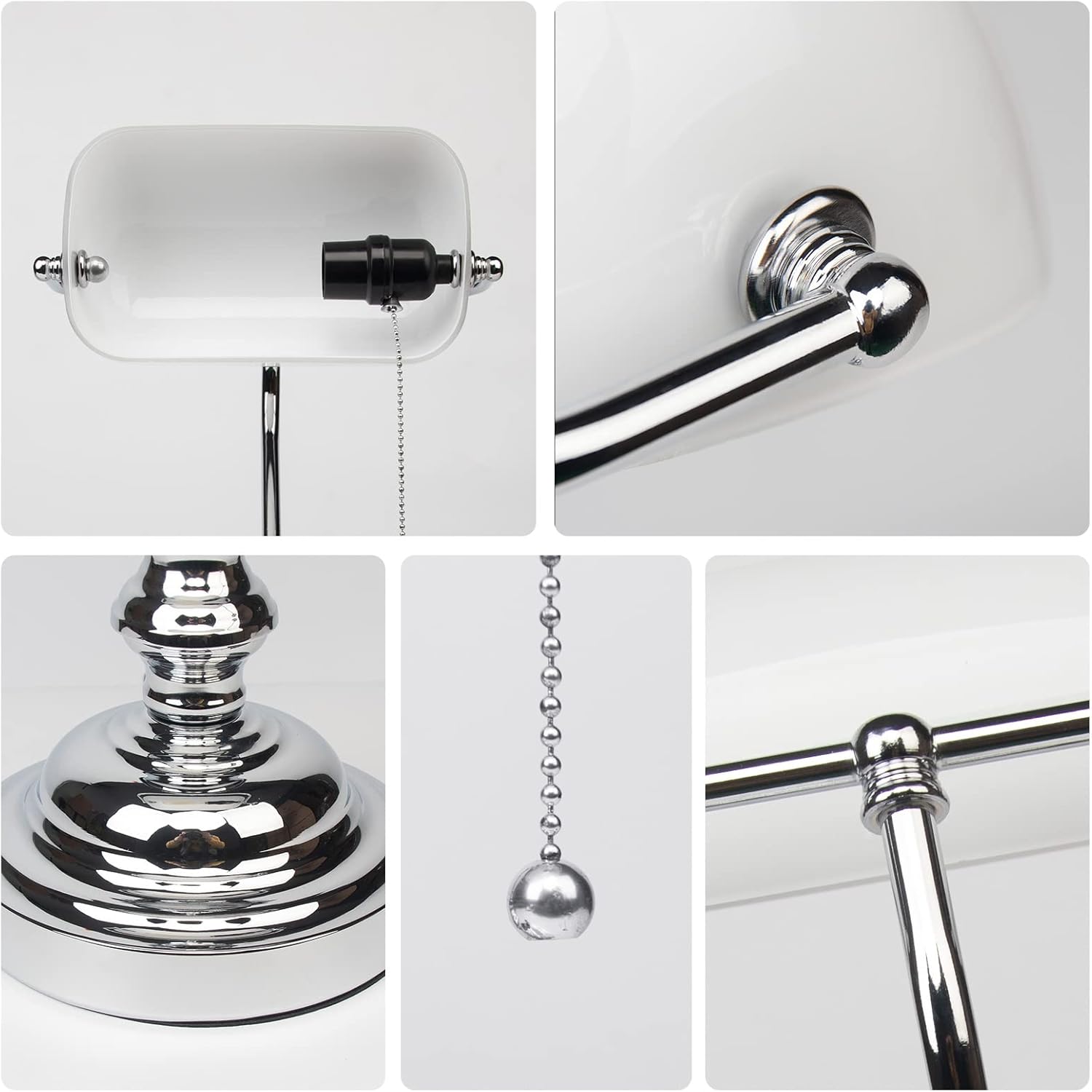 Bankers desk lamp made of glass and metal gives a long life to the decoration of your room and the lighting of your home. Rotatable lampshade The lampshade of this Bankers desk lamp made of white glass can be rotated, which means it can provide multi-directional lighting to suit your needs. When you switch on the lamp, it emits beautiful and soft light. Wide range of practical It is a good home decor and a perfect gift for your families and friends. It can be used in children's room, study, library, office, bedroom, etc. Safe to UseCompatible with standard E26 base bulbs up to 60 watts(Bulb Not Include); silver metal body prevents rust and decay for greater durability; UL-listed power plug is safe to use.User-friendlyThe lampshade can be rotated 350° for flexible multi-directional lighting, you can adjust the light-emitting angle according to your needs. Suitable for offices, libraries, bedrooms, etc.AttentionSince the lampshade is hand-blown glass material, please hold it gently.