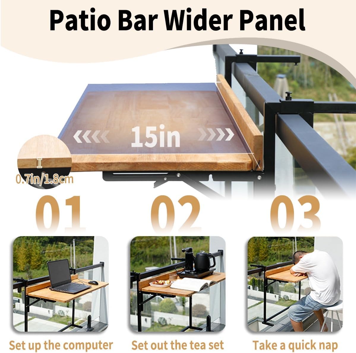 Tired of the bulkiness of traditional bar tables? - This solid wood foldable hanging bar table perfectly solves the space problem and creates a flexible and changeable leisure corner for you!- Our folding table can be hung on railings, walls, windows, is ideal for small spaces such as balconies, and is easy to assemble and install.- This balcony hanging table provides convenience for all small spaces, and at the same time it can be used as a dining table/computer table/shelves/learning table.Specifications:Product Name: Folding Balcony Hanging TableMaterial: WoodFolding angle: 90 degreesProduct Size: 23.6x15in/60x38cm ; 35.4x15in/90x38cm ; 47.2x15in/120x38cmAdjustable Bracket Width: 0.4-6.3 inScope of application: Outdoor Indoor Room, Living Room, Dining Room, KitchenCore Selling Points:- 38cm widened solid wood layer: selected solid wood, natural texture, sturdy and durable, easy to place wine glasses, notebooks, green plants, etc.- One-second folding and storage: easy to fold when not in use, wall storage does not take up space, small apartment savior!- Multi-scene versatile: balcony coffee corner, terrace bar, window viewing platform, stair corner bookshelf... hang it wherever you want, instantly improve the style of the space!Box Contains: 1 x Balcony Table1 x Assembly KitNote:1. Only wall-mounted folding tables are sold, and other products are shooting props.2. Due to the influence of the monitor and light, the actual color of the product may be slightly different from the color shown in the picture. Thank you!3. Due to manual measurement, please allow a measurement deviation of 1-2cm.