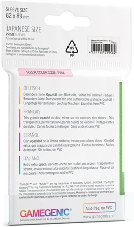 Our Japanese Size Prime Sleeves are 62 x 89 mm in size. They are ideal for card games like Yu-Gi-Oh!TM, NarutoTM, Cardfight!! VanguardTM and many others. These Japanese-Sized sleeves not only offer great protection for game cards. They also provide a great and easy shuffle feel. Because of the extra-high back-cover opacity, even in lighter colors, they are even perfect for tournaments. They also come in 12 different colors. One pack contains 60 sleeves.
