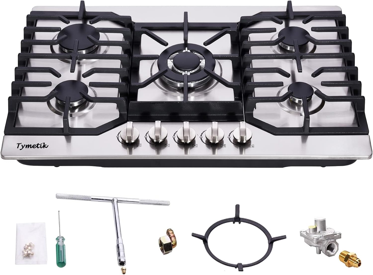 Tymetik is a famous household cooktops manufacturer, has professional product research and development team, which has been developing stoves for decades. Our stoves are energy-saving, safe, efficient and stable.Product Information: Main Material: Stainless Steel & Heavy-Duty Cast Iron & Zinc Alloy Fuel Type: Propane Gas/Natural Gas Ignition Type: Knob Electronic Ignition Power: 1 x 11262BTU + 1 x 9385BTU+ 2 x 5972BTU+ 1 x 3413BTU Voltage: 110V Installation Type: Built-in Product Dimension: 29.9" x 19.7" x 3.0" Cut-out Dimension: 28.7" x 18.9" Packing List: 1 x 30" Gas Cooktop 1 x Gas Regulator 1 x Brass Connector 1 x LPG Conversion Kit(5 x Propane nozzles, 1 x Screwdriver, etc.) 1 x Wok Stand 1 x Cut-out Template Board 1 x User Manual 1. We provide a 1-year warranty for this gas stovetop, replace a new one directly once it has any quality problems. 2. If you encounter any product after-sales problems, you can always contact our Bakysso customer service team.