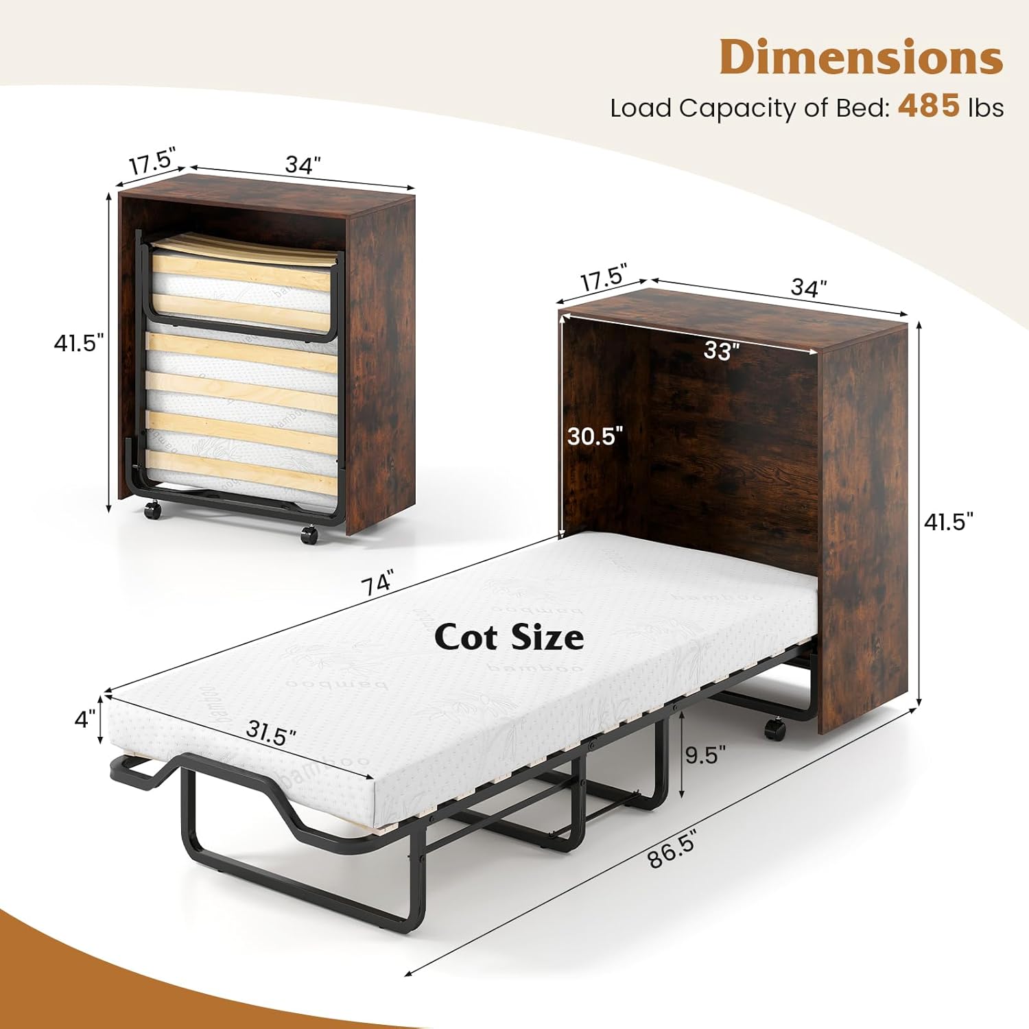 Description: With its versatile convertible and folding design, this murphy bed effortlessly transforms from a cot-sized foldable bed into a compact cabinet, maximizing your space. Included is a comfortable 4’’ mattress that combines memory foam and a washable cover for a restful sleep. Built with a sturdy metal frame, 15 birch wood slats, and anti-slip foot pads, this fold out bed supports up to 485 lbs, providing a secure and stable sleeping surface. For added ease, the rollaway bed with cabinet features 2 pull handles and 4 smooth-rolling universal wheels, making mobility simple. Moreover, two of casters are lockable for have higher stability. Discover even more thoughtful features designed for your convenience. Note: Simple assembly is required for this roll away bed. Features: Includes a 4’’ thick mattress delivering optimal comfort and proper support Functions both as a storage cabinet and a cot-sized bed Can be used with or without the cabinet for flexible functionality Compactly folds for convenient storage when not in use Folding bed constructed with a reinforced metal frame for durability Equipped with 15 birch wood slats to provide a stable sleeping platform Mattress stopper keeps the mattress securely in place Dual pull handles allow for easy operation of the bed Features 4 universal wheels, including 2 lockable for safety and stability Anti-bumping design enhances user safety during use Fixation strap with hook-and-loop fasteners ensures the bed stays securely folded Screw hole covers maintain a clean, polished appearance Anti-slip foot pads protect your floor from scratches Specifications: Color: Rustic Brown/White Material: Metal, Engineered Wood, Foam Unfolded Dimensions: 86.5” x 34” x 41.5” (L x W x H) Size of Cabinet Top: 34” x 17.5” (L x W) Size of Cabinet’s Interior Space: 33” x 30.5” (L x H) Size of Bed Surface: 74” x 31.5” (L x W) Thickness of Mattress: 4” Height of Under-Bed Clearance: 9.5” Folded Dimensions: 34” x 17.5” x 41.5” (L x W x H) Load Capacity of Bed: 485 lbs Load Capacity of Cabinet Top: 22 lbs Net Weight: 89.5 lbs Package Includes: 1 x Murphy Bed 1 x User Guide