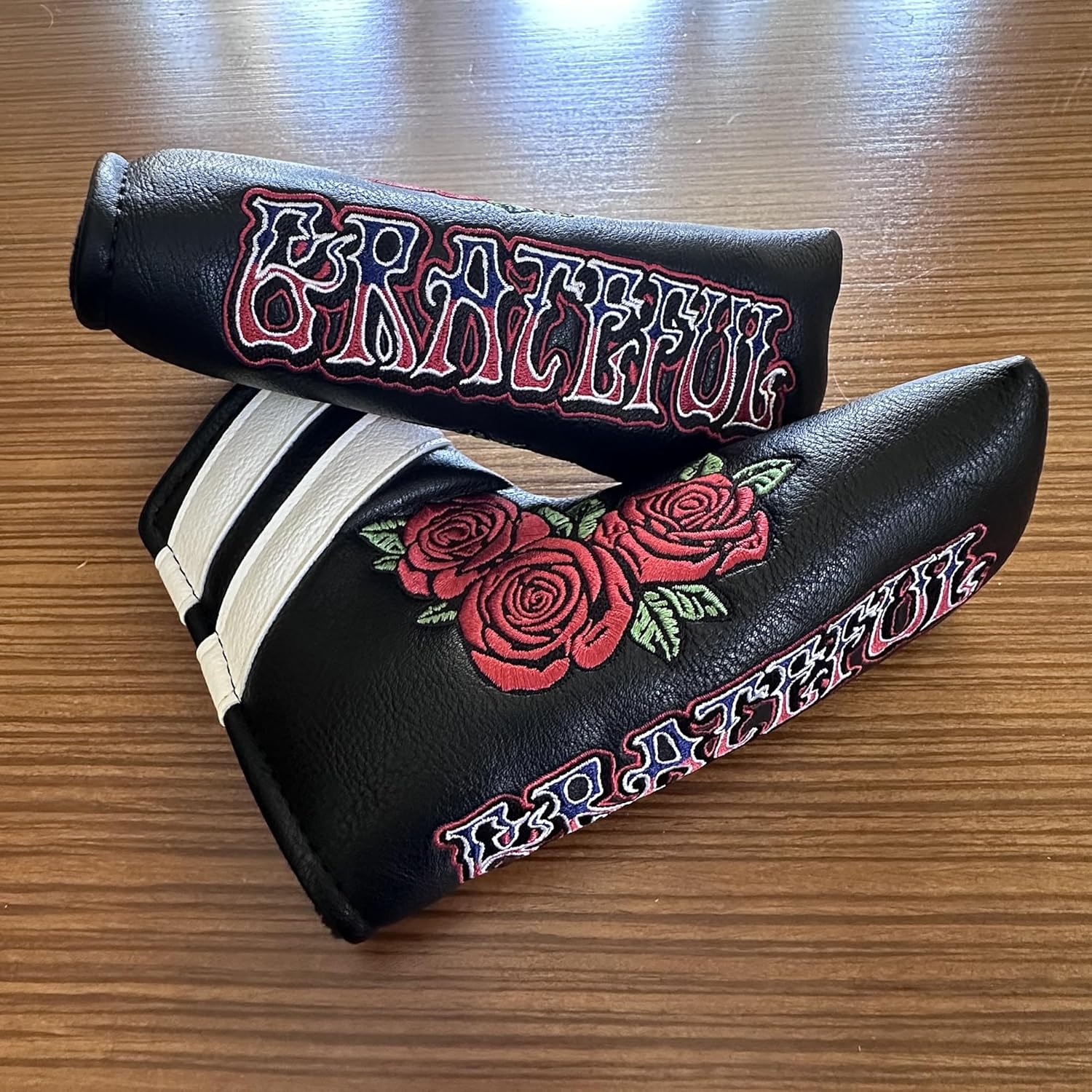 Our Phunky Threads retro style “Grateful” putter cover is leather and has a vintage throwback style design, made to fit most putters. They are water resistant and constructed with a velvet lining, leather stripes and embroidered “Grateful” and roses. 6.9″ x 3.15″ x 3.35″ x 4.72″. Magnet closure on the long side.