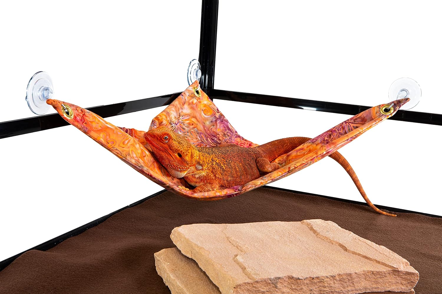These hammocks by Carolina Designer Dragons provide a comfortable, elevated vantage spot that bearded dragons are known to enjoy in their houses. These hammocks also feature the same “hand-sewn in the U.S.A.”, machine-washable benefits as the Chaise Lounges by Carolina Designer Dragons. The sewn-in internal batting gives a comfortable feel for your bearded dragon and won’t get lumpy after machine washing. Hammock size measures 16” x 16” x 22” and comes with three suction cup hooks; rated for 3 pounds. We are now including these suction cup hooks instead of the adhesive hooks because more people use glass style cages than the wood or melamine style cages. We do sell the adhesive hooks separately for use with the wood or melamine style cages. We tried other hammocks on the market that have suction cups grommeted to the hammock. What we found was that to clean the hammock, you had to pull the suction cups off the side of the cage. Over time, this decreased the effectiveness of the suction cups to the point that they didn’t work. Then, since they were physically attached to the hammock, the entire hammock went into the garbage. Some other hammocks on the market are made from a plastic mesh or seagrass, not something you want to just throw into the washing machine. So when they get soiled (poop), you end up having to scrub them clean by hand with a small brush; reserved just for this task. When positioning your hammock consider the height of your hammock in relation to your dragon. You want the front curved edge to be low enough for your dragon to climb into. This may include the use of a habitat accessory such as a Natural Habitat Rock to climb onto first. Habitat accessories are available separately from Carolina Custom Cages, a division of Carolina Designer Dragons, Inc.
