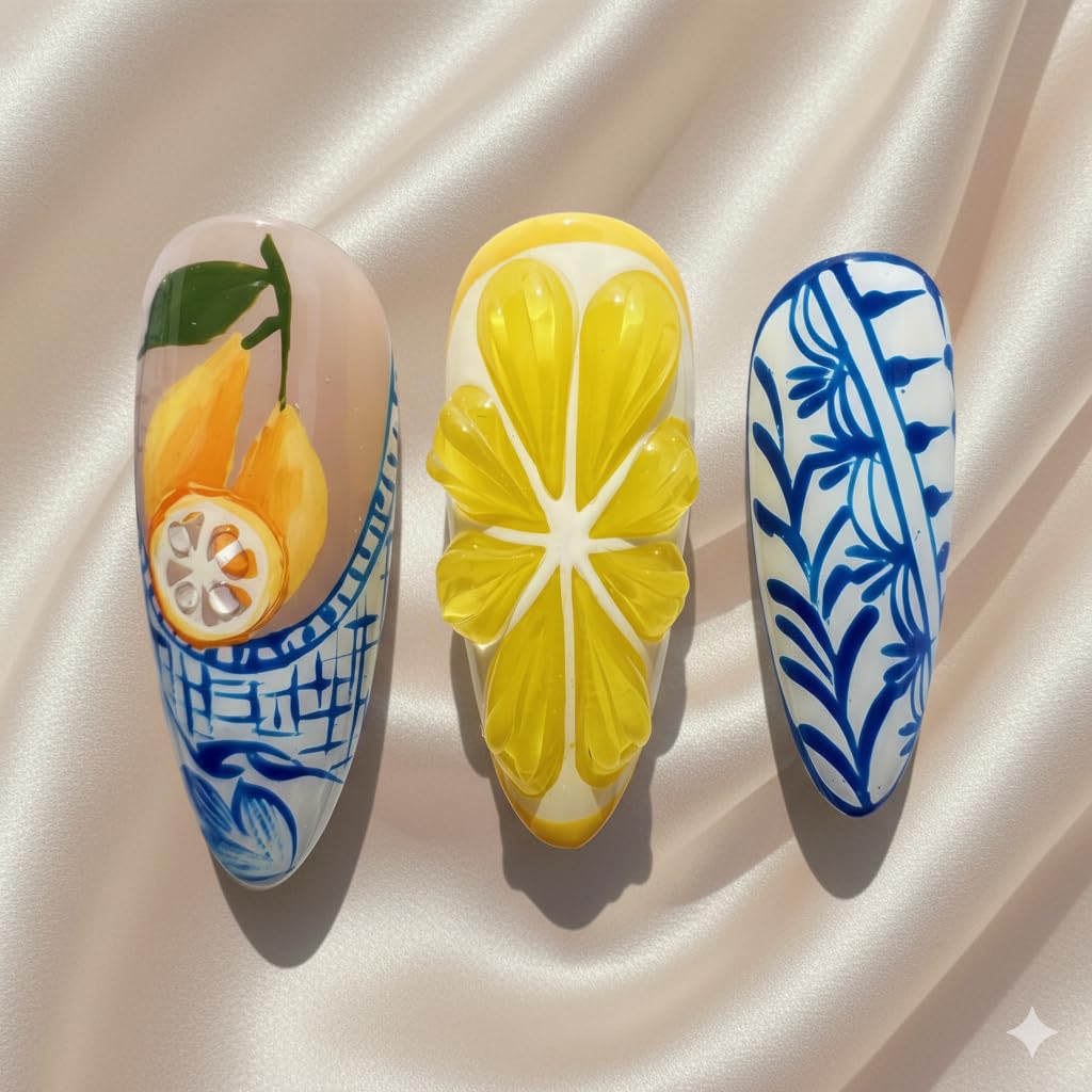 Design Inspiration Inspired by the sunlit charm of the Mediterranean coast, this nail set blends the vibrant lemon yellow, deep ocean blue, and classic white porcelain patterns seen in coastal Italian homes. The design captures the beauty of blue ceramic tiles, hand-painted floral art, and the refreshing elegance of a summer afternoon filled with light and citrus. Style & Mood Wearing this set feels like a slow afternoon in southern Italy — fresh lemons in a basket, blue-and-white pottery on the table, and warm sunlight dancing across your fingertips. It’s effortlessly elegant, refreshing, and artistic, perfect for women who love a mix of European sophistication and natural brightness. The Vibe A balance of sunshine and calm — the yellow brings energy, while the blue adds timeless class. Every gesture feels like a brushstroke from a Mediterranean painting — bright, confident, and effortlessly chic.