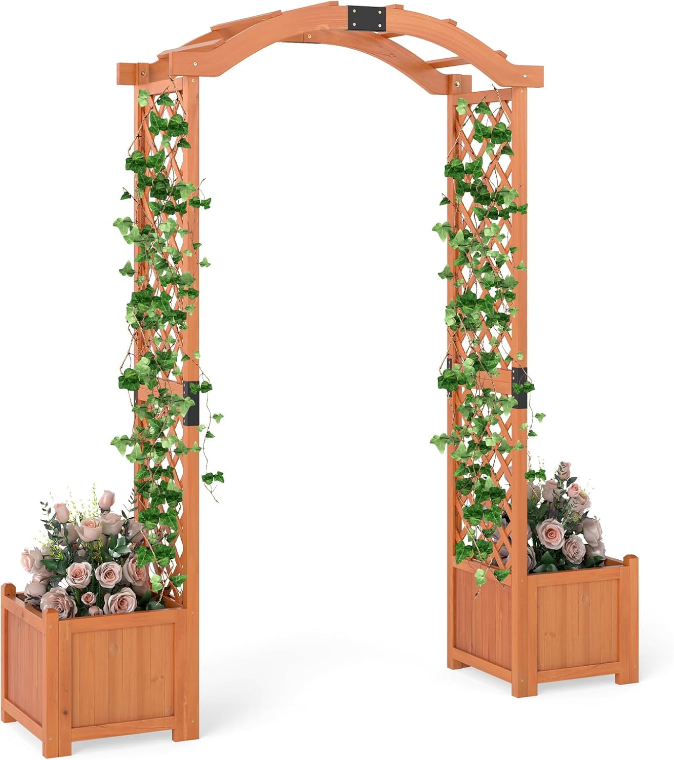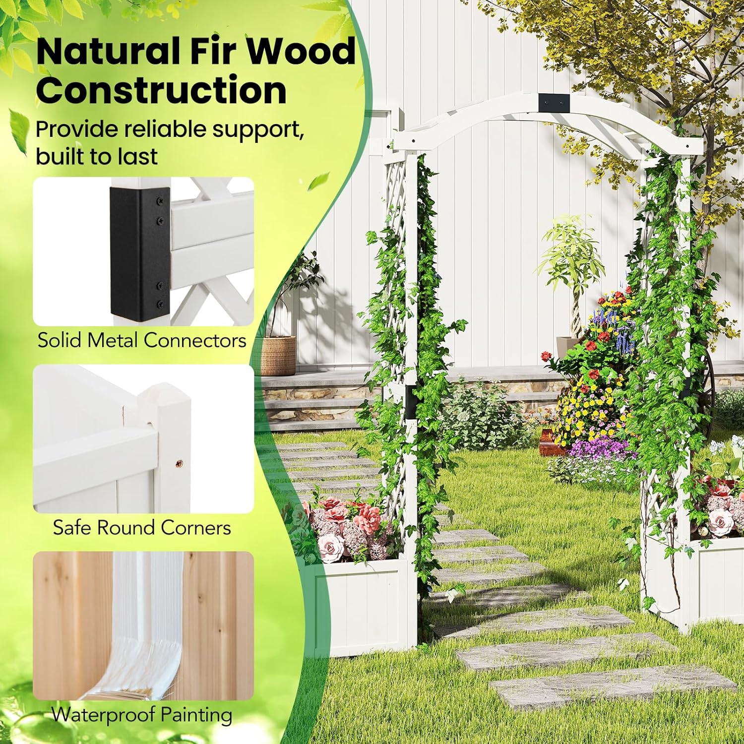 Description: Create a vibrant and beautiful garden with our wooden garden arbor! Constructed using natural fir wood, the garden arbor is sturdy, durable, and resistant to warping. The design of the arched roof and climbing plant shelves allows climbing plants to grow healthily and vigorously. You can also DIY some decorations according to different occasions. Additionally, there are two planters on either side where you can plant flowers or vegetables. The planters have drainage holes to facilitate drainage. Features: Constructed from sturdy solid wood material, durable and long-lasting Two deep planters provide a suitable place for planting root plants Plant shelves on both sides provide growing space for climbing plants Multifunctional design offers various choices for decoration and planting Decorative arched design for adding a variety of decorations Built-in drainage holes help excess water to flow out Reinforced planters at the four corners prevent water leakage Reinforced hinge connections ensure a secure connection Specification: Color: White/Orange Material: Fir Wood Overall Size: 73" x 18" x 79" (L x W x H)/ 185cm x 45cm x 201cm(L x W x H) Planter Box Inner Size: 15" x 15" x 11" (L x W x H)/38cm x 38cm x 28cm Passable Width: 40"/100cm Net Weight: 31 lbs/14kg Package includes: 1 x Wooden Planter Arch 1 x User Guide