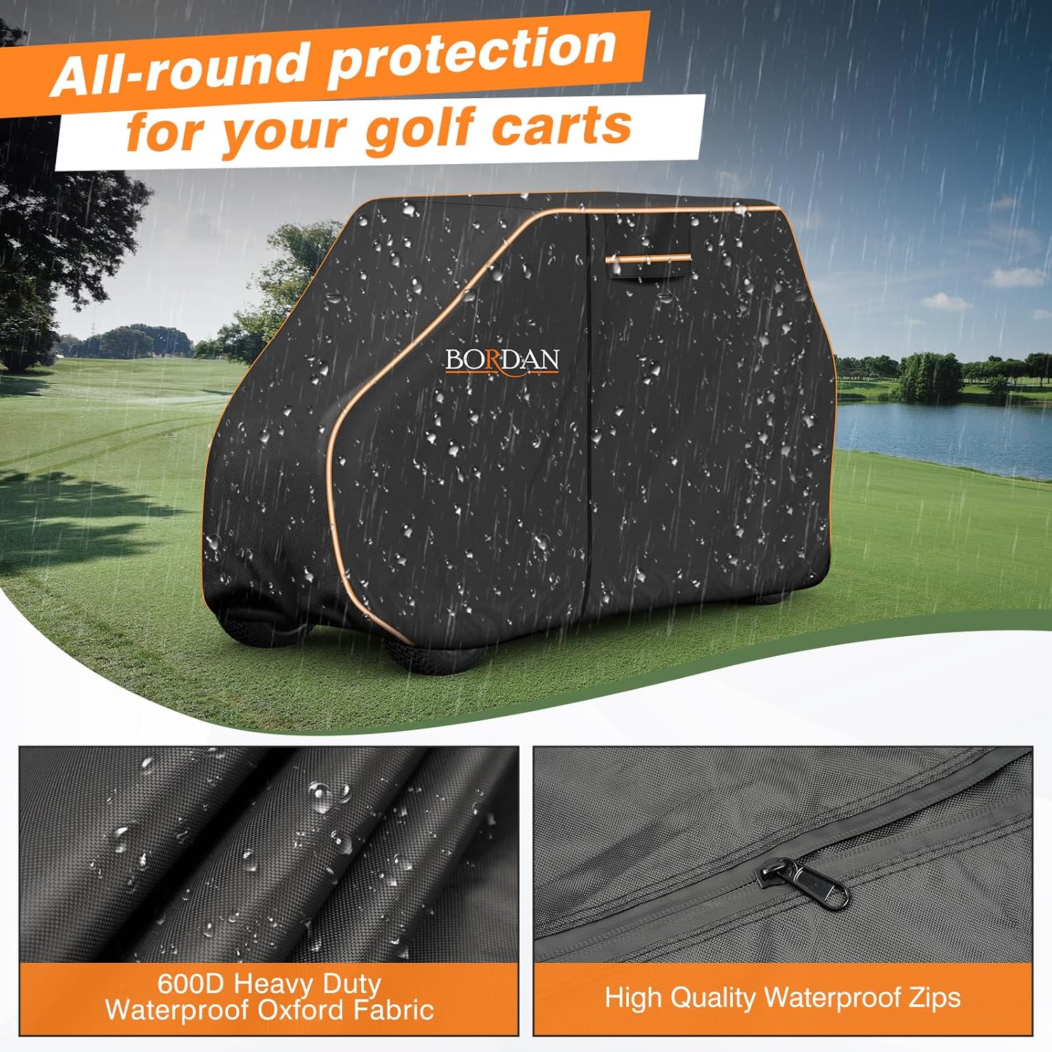 Crafted from 600D polyester enhanced with waterproof coating. This fabric is not only thicker, more durable and tear-resistant, but also features excellent waterproof capabilities. The high-level double stitching not only adds to its durability but also ensures a snug fit, safeguard your precious golf cart against the punishing forces of nature like heavy downpours and scorching sun.