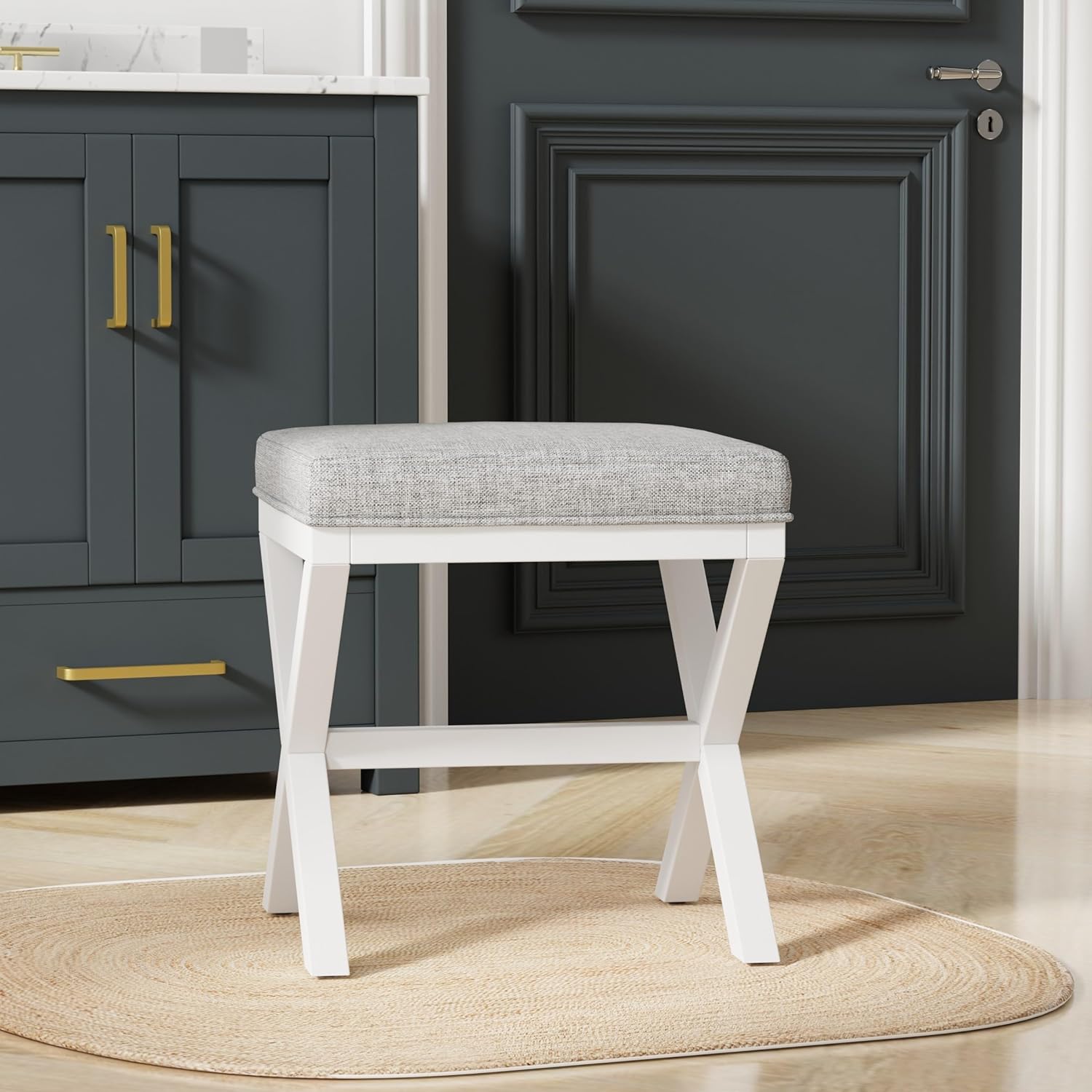 With a sleek low profile, this backless vanity stool knows how to multitask gracefully. An amply padded square seat upholstered in gray silver fabric features tailored welting across the top and bottom of the cushion, displaying its impressive angles. Meanwhile, the wooden x-style base in a white wire brush finish brings together timeless style and durability. Built for life beyond the vanity as well as in front of it, place this stool in your foyer to make removing your shoes easier, tuck it under your bathroom counter or bring it to the living room to prop up your feet after a long day. Assembly required.