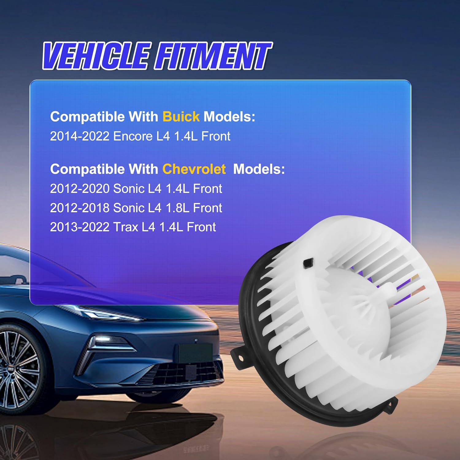 Compatible with Chevrolet: AC Blower Motor with Fan Cage 2012 2013 2014 2015 2016 2017 2018 2019 2020 For Chevrolet Sonic L4 1.4L AC Blower Motor with Fan Cage 2012 2013 2014 2015 2016 2017 2018 For Chevrolet Sonic L4 1.8L AC Blower Motor with Fan Cage 2013 2014 2015 2016 2017 2018 2019 2020 2021 2022 For Chevrolet Trax L4 1.4L Compatible with Buick : AC Blower Motor with Fan Cage 2014 2015 2016 2017 2018 2019 2020 2021 2022 For Buick Encore L4 1.4L AC Blower Motor with Fan Cage Interchange Part Numbers: 700309, 95472959, 95920148, SK700309, 2311839, 1581725