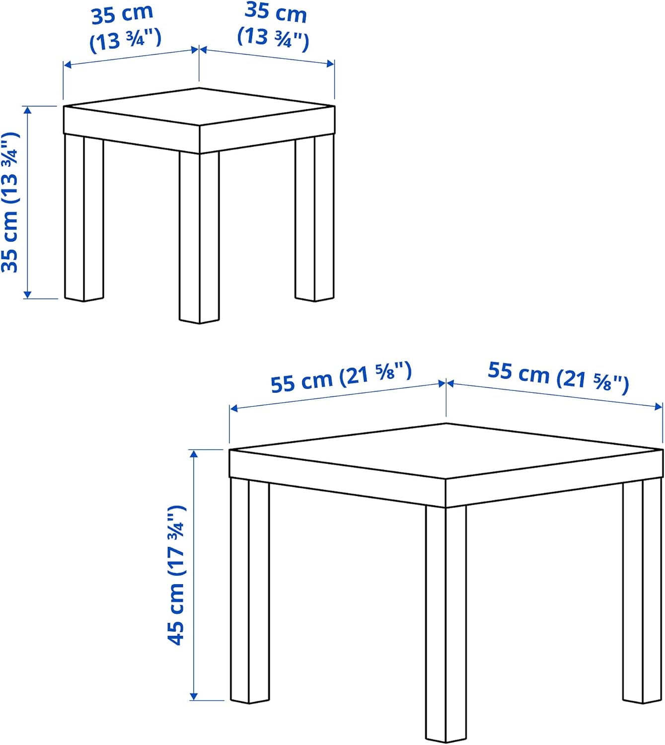 Key featuresMay be combined with other products in the LACK series. Also matches well with the KALLAX series which has the same construction and material.You can use these LACK tables individually, together or as nesting tables by sliding the smaller one under the larger one, for example to save space when it´s not in use.The design of the tables makes them easy to use for various needs and to match with other furnishings in your home.The honeycomb paper construction adds strength to the tables while keeping them lightweight. This makes them easier to bring home, place and move around at home.