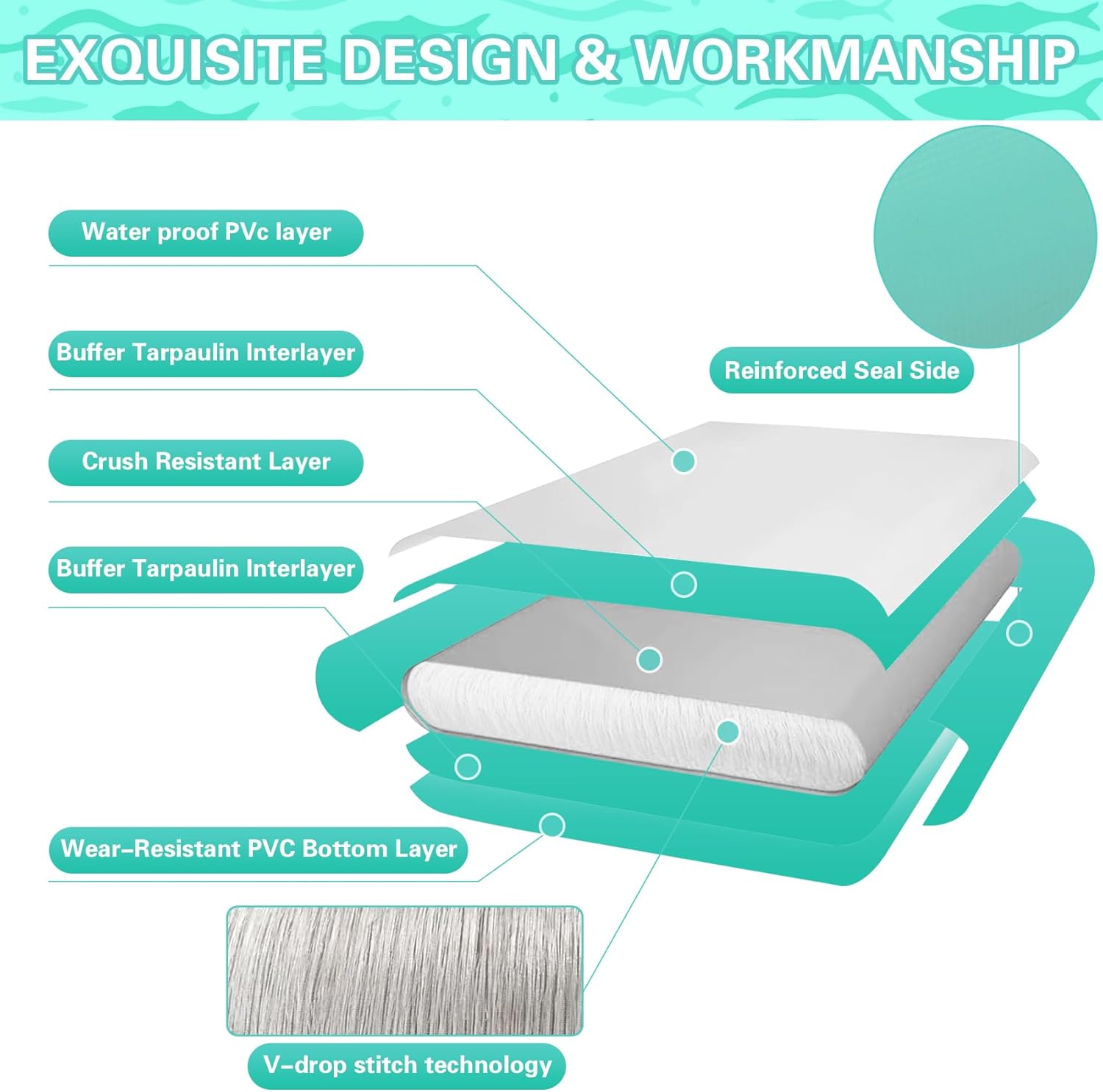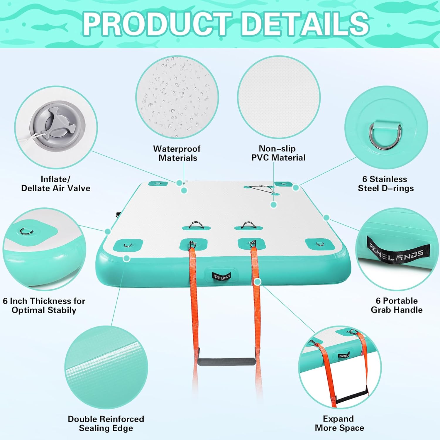 This is a versatile inflatable float platform suitable for a variety of water activities, including leisure, yoga, and fishing. Made from three layers of eco-friendly PVC and fully covered with a non-slip EVA surface, it has a weight capacity of 400 pounds and can accommodate 3–5 people. Equipped with 6 marine-grade D-rings, it can be quickly attached to boats or other floating devices. Available in 5 colors, it is ideal for use on lakes, rivers, in swimming pools, and at sea. Comes with detailed instructions and worry-free after-sales service. Translated with DeepL.com (free version)