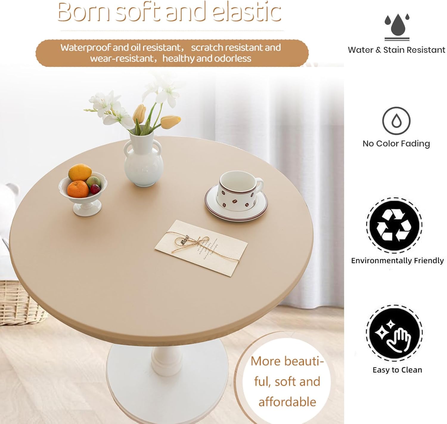 Fitted Vinyl Round Tablecloth with Elastic Edge, Waterproof Wipeable Plastic Table CoverProducts: Fitted Vinyl Round TableclothMaterial: Vinyl, PVCFunctions: Waterproof & oil-proof. You can use it for family dinner, party, holiday, decoration, etc.Sizes: 48 inch, 55 inch, 63 inch, 48x23 inch, 72x30 inch, 96x30 inchWash Tip: Easy to Care, Wipe clean.Occasion: Daily Use, Birthday, party, Family Dinning, picnic, BBQs, Holiday Dinner Parties and More.Package: 1 x Table CoverFEATURESThe product is comfortable and durable.Elegant Design: Simple solid color design. Modern and elegant style, suitable for a variety of home decoration styles.Waterproof: It is oil-proof, dust-proof and waterproof, making it the perfect table cover protector for your table.Please measure your table before purchasing the tablecloth.