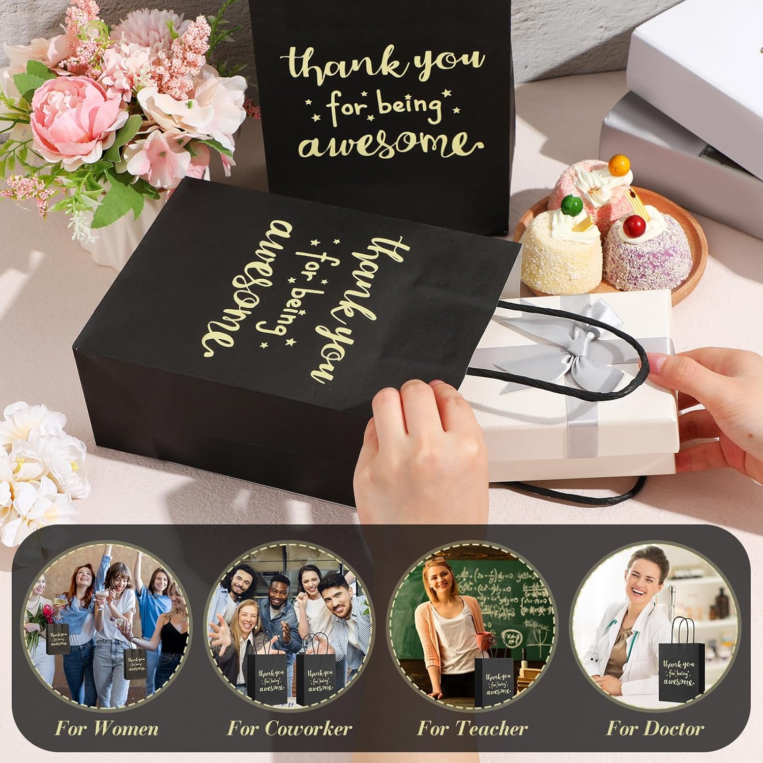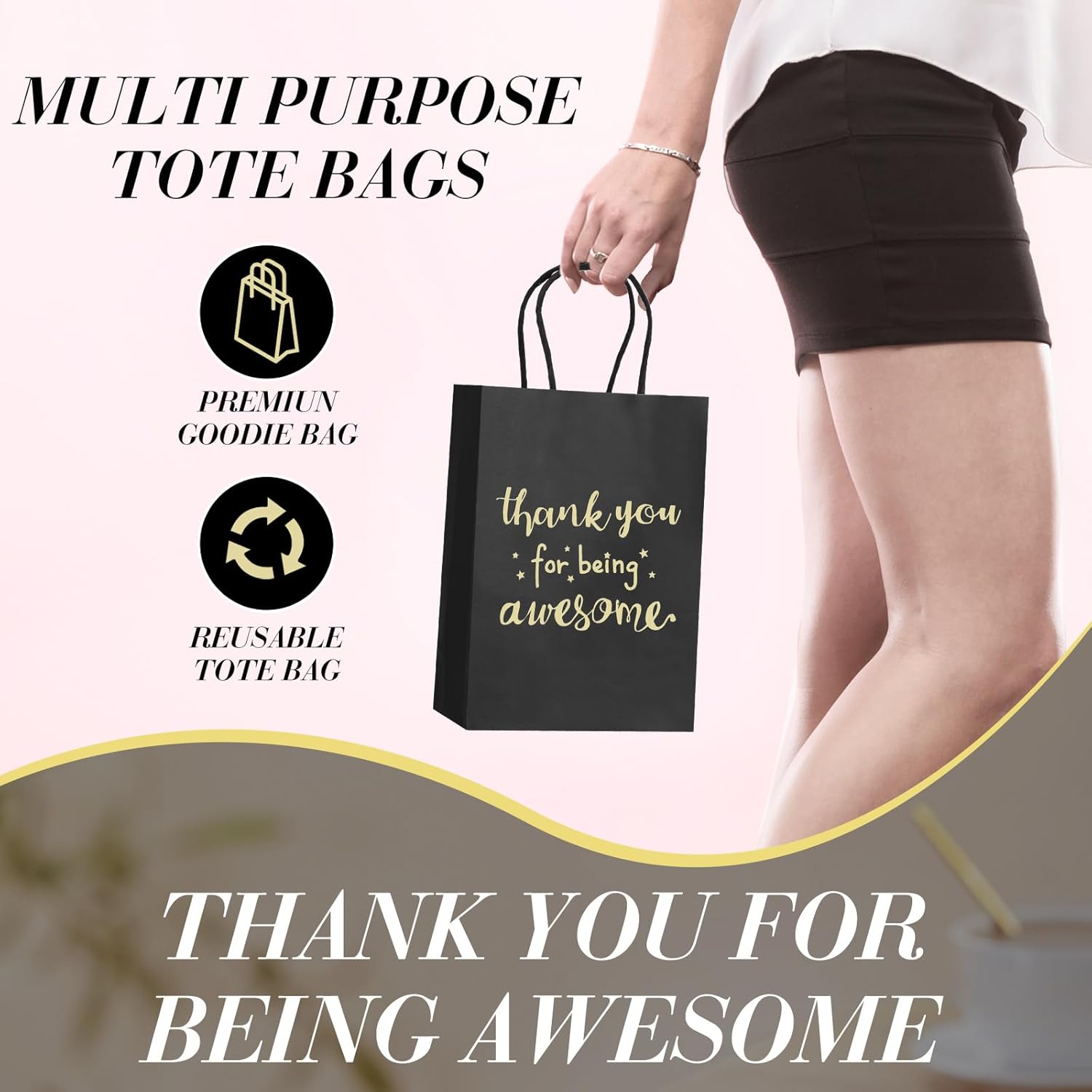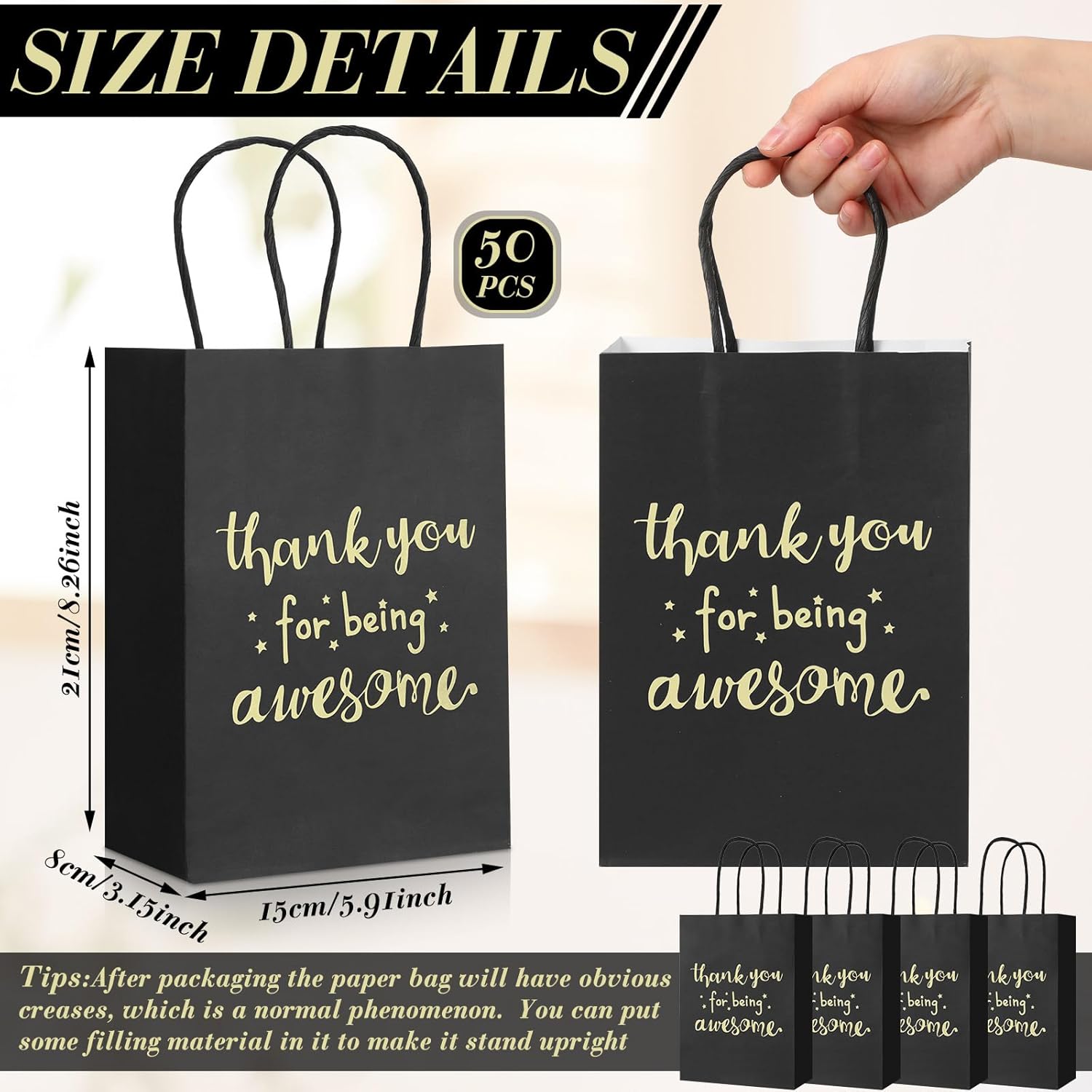 Features: Classic color: These small shopping bags feature classic colors. It is help to let you can decorate it with small stickers and painting follow your own way. You can express your thanks and enjoy the fun of creating. Convenient to use: The small bags with handles are portable and easy to carry, can be applied in wedding, home, family gathering, party, shopping and more, delicate and exquisite. Specifications: Material: paper Main color: black Size: about 5.9 x 3.1 x 8.3 inches/ 15 x 8 x 21 cm Package includes: 50 x Thank you paper gift bags Notes: Manual measurement, please allow slight errors on size. The color may exist a slight difference due to different screen displays. The words printed on the products are only for decorative using, not working as trademark using, our trademark is Jetec. Kindly noted.