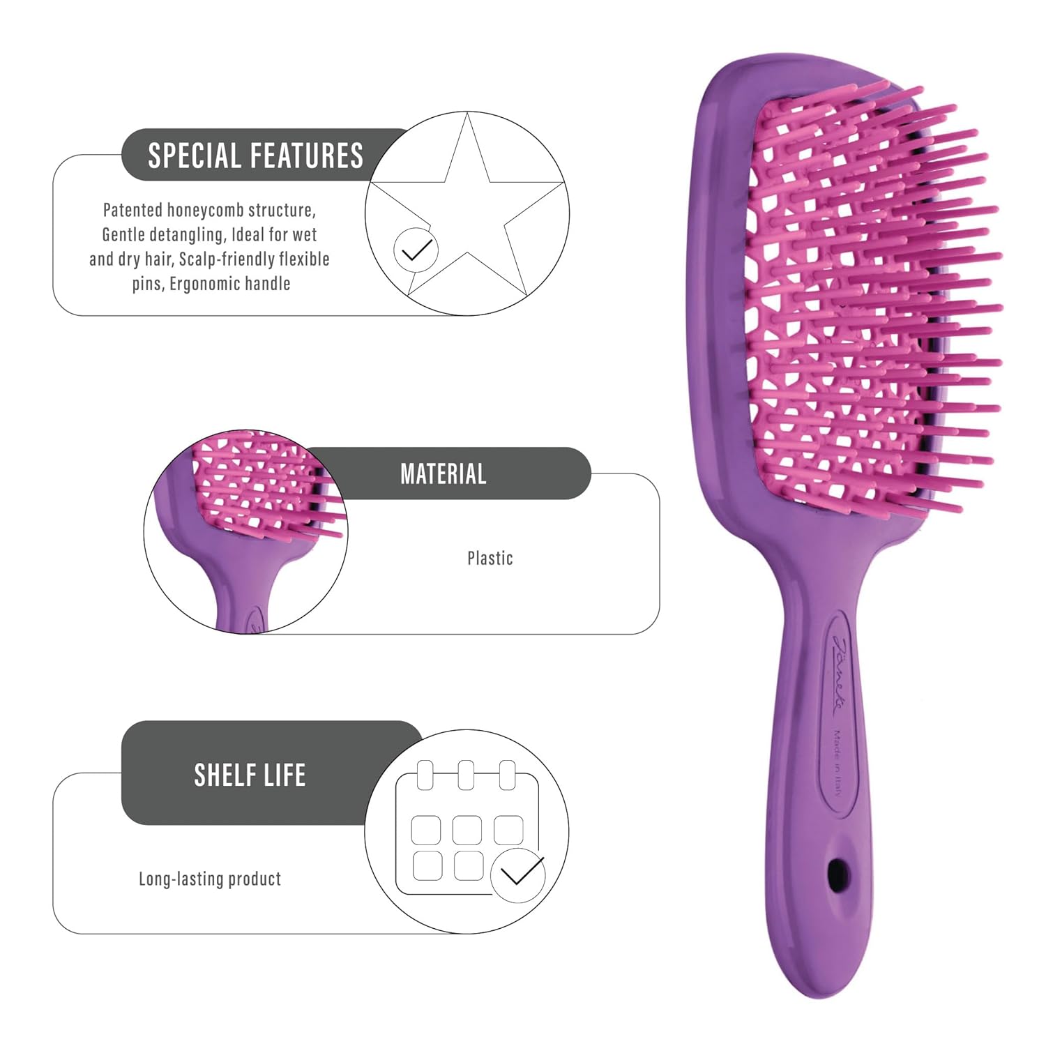 Superbrush gently and effectively detangles thanks to its soft tips and its particular patented beehive perforation allows for very quick drying. Also perfect in the shower or with damp hair, to apply the cream and detangle in just a few steps