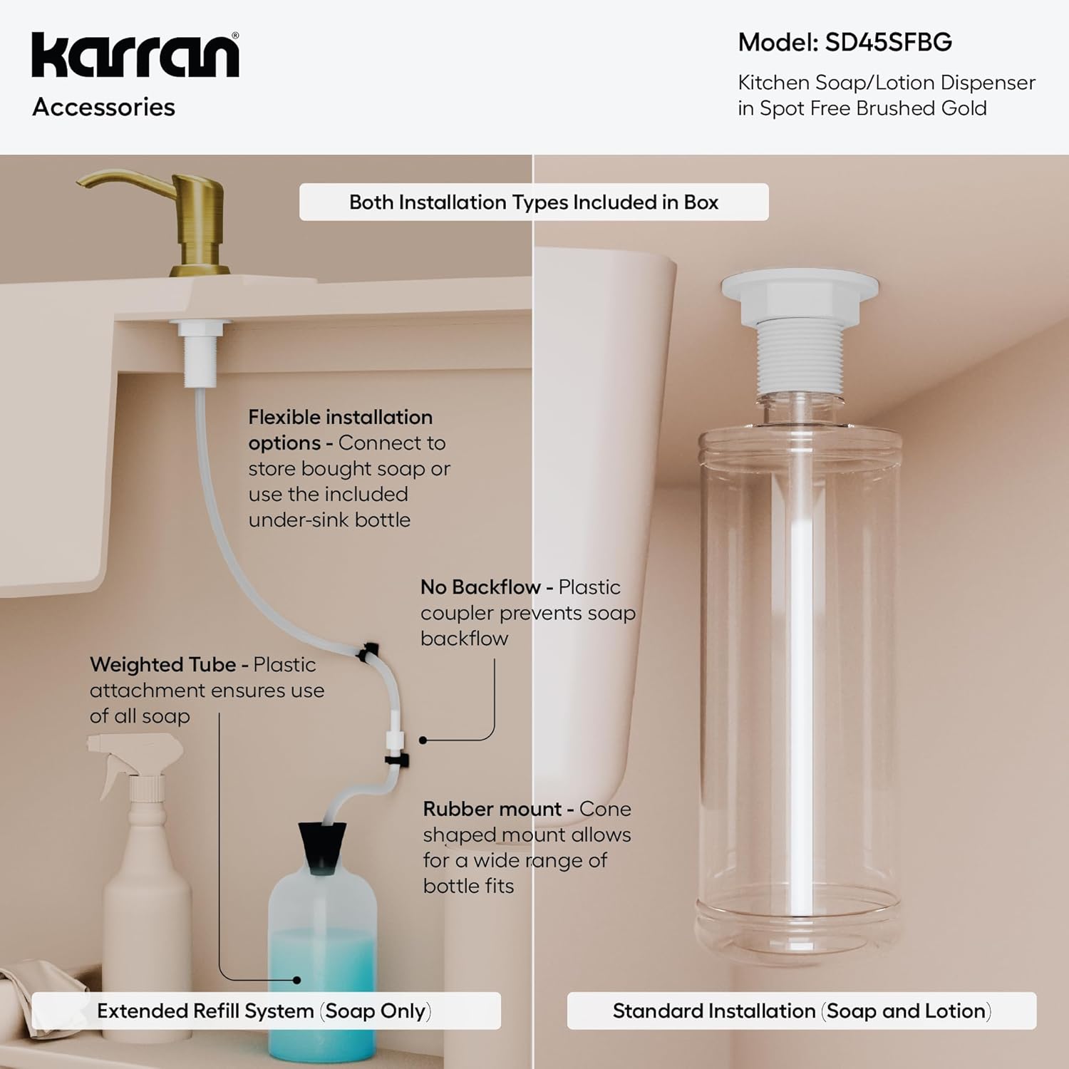 Upgrade your kitchen with the Karran SD45 Soap & Lotion Dispenser—an elegant, heavy-duty accessory designed to match today’s most popular faucet finishes. Whether you choose Chrome, Stainless Steel, Matte Black, Gunmetal, or Champagne Bronze, each finish is crafted to resist fingerprints, spots, and water marks while delivering long-lasting shine. The SD45 offers dual refill flexibility, giving you the freedom to refill from above the counter using the included 10 oz bottle or connect directly to any large store-bought soap bottle in your cabinet with the 47" silicone extension hose. No more messy refills, awkward reaching, or running out of soap mid-task. Built for busy kitchens, the SD45 features a commercial-grade self-priming pump that dispenses smoothly and consistently without clogging. A built-in backflow preventer keeps soap clean and fresh by preventing contaminated liquid from returning to the bottle. Premium construction ensures corrosion, rust, and wear resistance, offering long-term performance for thousands of pump cycles. Designed to fit standard 1-1/4" installation holes and most countertop materials, this dispenser installs easily and pairs seamlessly with Karran faucets for a coordinated, high-end look. With modern styling, spot-free finishes, and truly effortless refilling, the SD45 Soap Dispenser is the perfect upgrade for homeowners who want both convenience and refined design. Keep your sink area cleaner, your soap supply plentiful, and your kitchen looking beautifully coordinated—every single day.