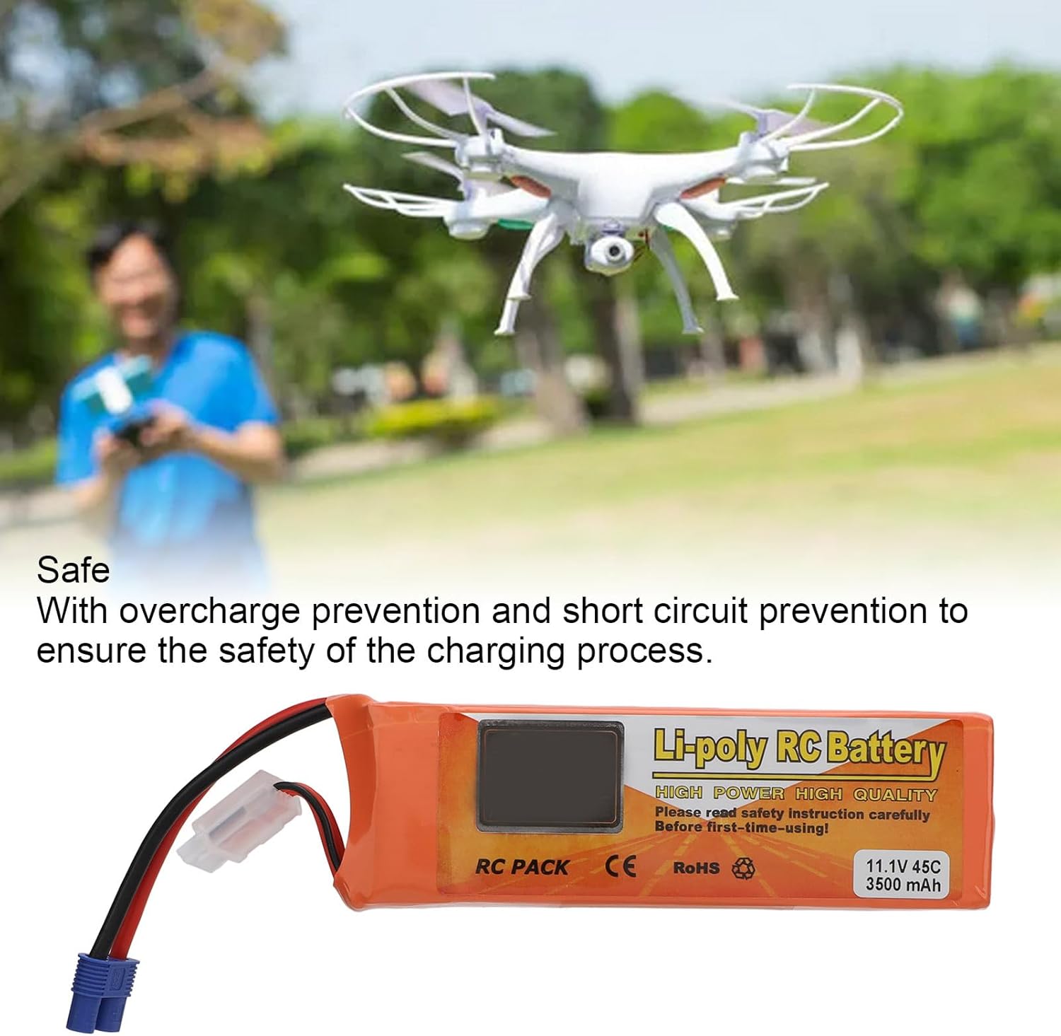 1. LIGHTWEIGHT DESIGN: The lightweight design makes it easy to carry. Users can conveniently take the battery with them on their outings to provide sufficient energy support for the drone.2. PREMIUM MATERIALS: The lithium battery case is made of premium materials, which is sturdy and and has a long service life. Users can use it with confidence and enjoy a stable experience.3. HIGH CAPACITY: The capacity of the lithium battery is up to 3500mAh, which provides lasting and stable power support for the drone and allows users to fully experience the fun of flying.4. SAFETY PREVENTION: It has overcharge prevention and short circuit prevention function. This function can effectively prevent accidents during the charging process and ensure the safety of the charging process.5. STABILIZED VOLTAGE: The voltage of the drone battery is 11.1V, which can provide stable voltage output to ensure the stability and performance of the drone. Users can use the battery with confidence and enjoy a smooth experience.Specification:Item Type: Drone BatteryMaterial: Lithium PolymerBattery Capacity: 3500mah Lithium Battery (With Pure Battery Shipment)PackageList:1 xDrone Battery