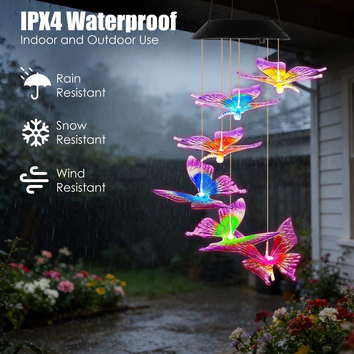Product Type: Solar Wind ChimesQuantity Options: 1Pcs, 2PcsStyle Options: Blue & Red Butterflies, Purple & Yellow ButterfliesMaterial: ABS and PVCSolar Panel: Polycrystalline SiliconBattery Type: 600 mAh Ni-MH AA rechargeable battery (included)LED Quantity: 6 LEDsLED Color: Multi-Color ChangingCharging Time: Approx. 8 hours(charge directly in the sun)Working Time: Approx. 8 hours (fully charged)Waterproof Level: IPX4Hook Size: 2.8x4cm/1.10x1.57inPer Butterfly Size: 8x11cm/3.15x4.33inSolar Panel Size: 12.5x12.5x2.4cm/4.9x4.9x0.9inPer Item Size: 12.5x12.5x76cm/4.9x4.9x29.92inPer Item Weight: 150g/0.33 lbs