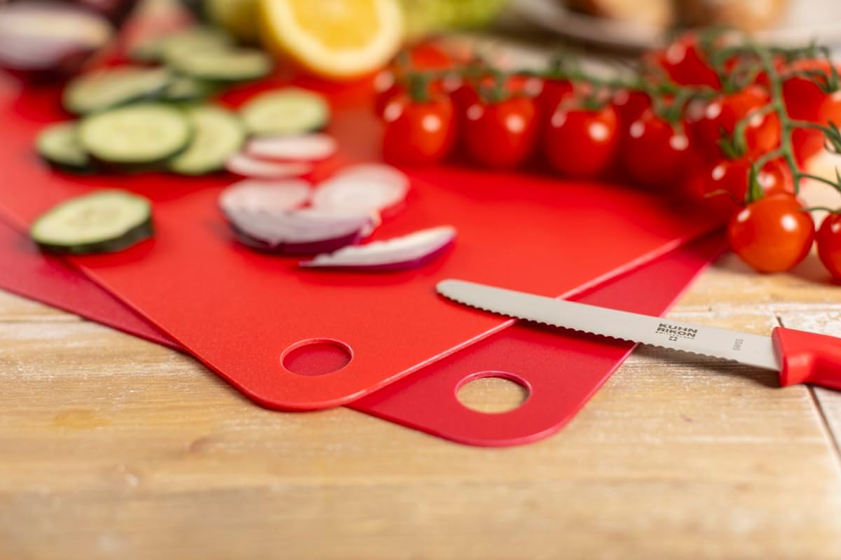 This practical chopping board set consists of two lightweight boards for convenient cutting of various ingredients. The different colours allow a clear separation for different foods. The flexible material can be easily bent to conveniently pour cut items into the pan or bin. The finely studded back prevents slipping and ensures safe cutting. Thanks to the hole, the chopping boards can be hung up to save space.