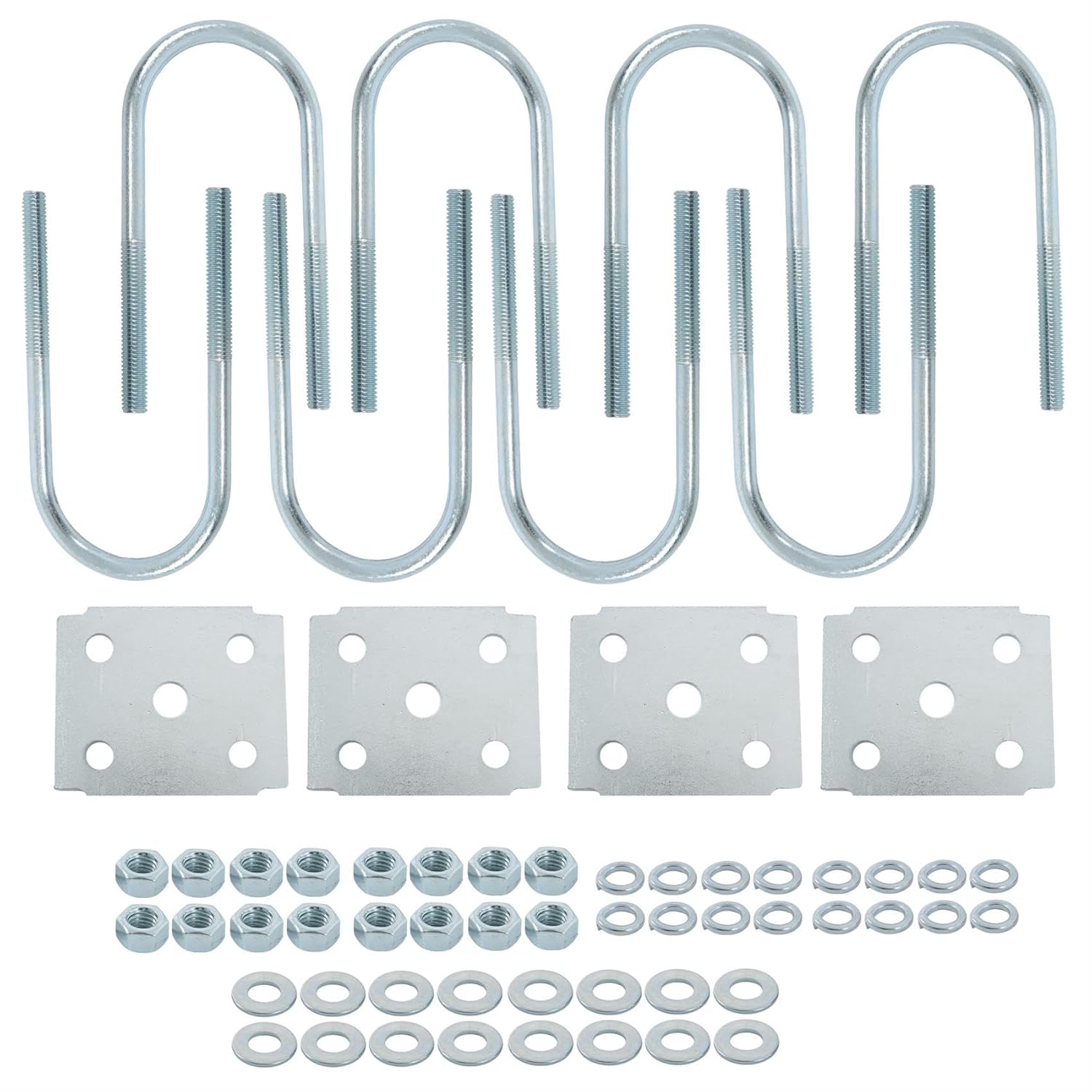 Fitment:Compatible with 3500lbs round axle which axle beam dia 2-3/8 inchPackage includes:8 x 5-1/2 inch long U bolts, 1/2 inch diameter16 x 1/2 inch -20 hex nuts4 x tie plates for 1-3/4 inch leaf springsEasy installation:Don't need special tool to install, directly replaces, removes the broken U bolts and nuts, installs the new kit.