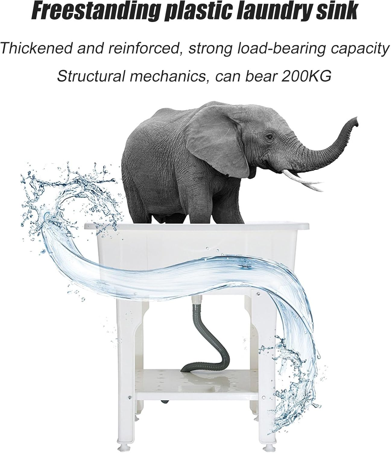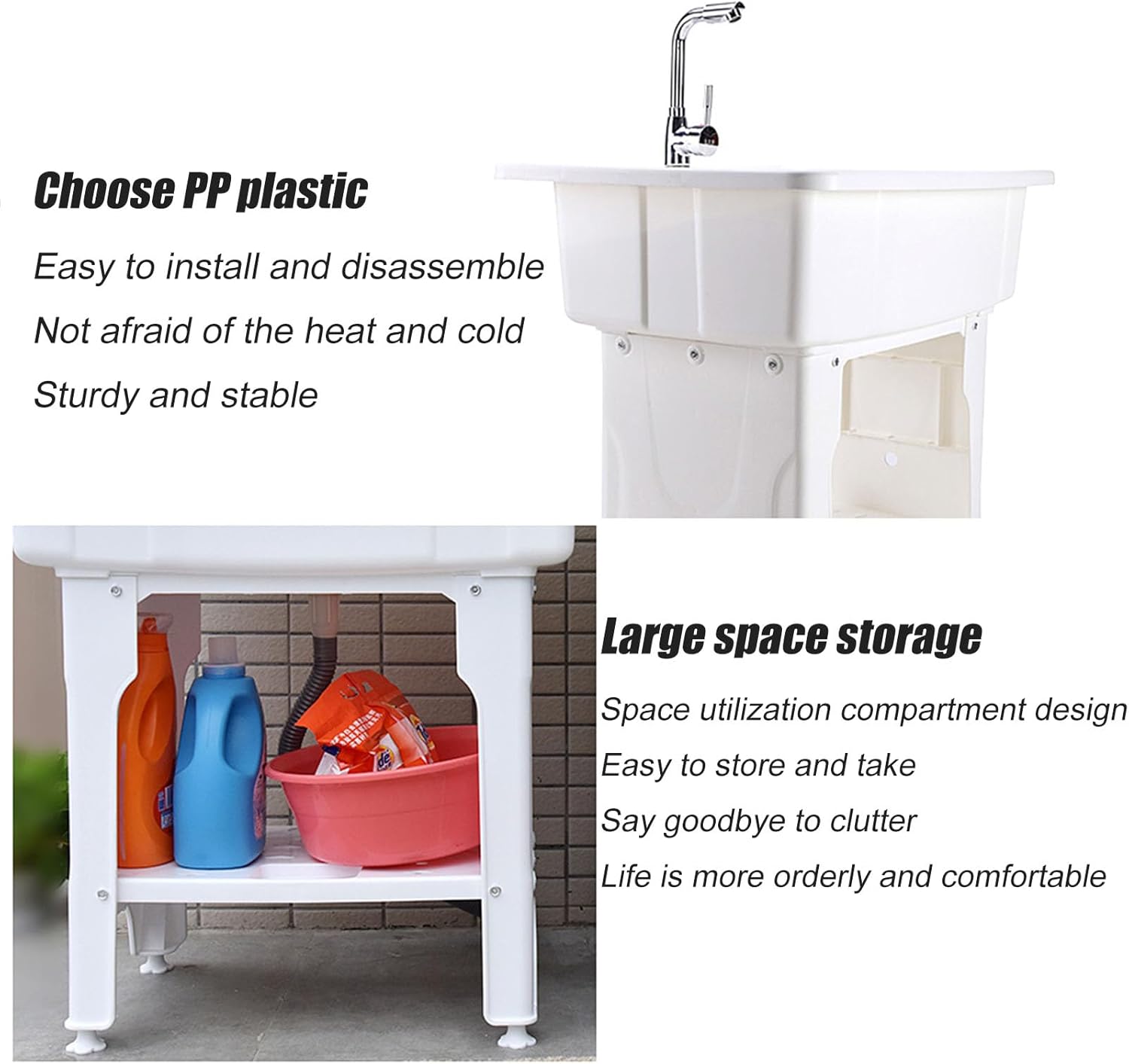 Utility Laundry Sink Plastic Laundry Tub, Garage Washing Station Laundry Sink, Complete Sink Set Indoor & Outdoor Use with Washboard, Faucet, Drain and Storage ShelfFreestanding sink with laundry board, equipped with hot/cold water faucet and drain pipe, brings practicality and convenience to your various housework;The classic white appearance and simple lines can be adapted to any home decoration style and are used in bathrooms, balconies, basements, garages, sinks and mud houses.SPECIFICATION:Product name: Freestanding Laundry SinkColor: white, grayMaterial: PP plastic materialSize: 65x56x80CM; 80x56x80CMAccessories: plastic sink, inlet pipe, angle valve, drain pipeApplicable scenarios: bathroom/balcony/rental room/factory/school/pet shopMULTIPURPOSE USE: :Cleaning items, washing clothes, suitable for laundry/utility room;Freestanding wash basin, or gardening tasks, used as an outdoor sink;Bathing pets, Pet Wash Station, bathing pets;Outdoor camping sink for cleaning dirty pots and grills;Temporary sink, very suitable for decoration;Portable sink, used as a garage or basement.
