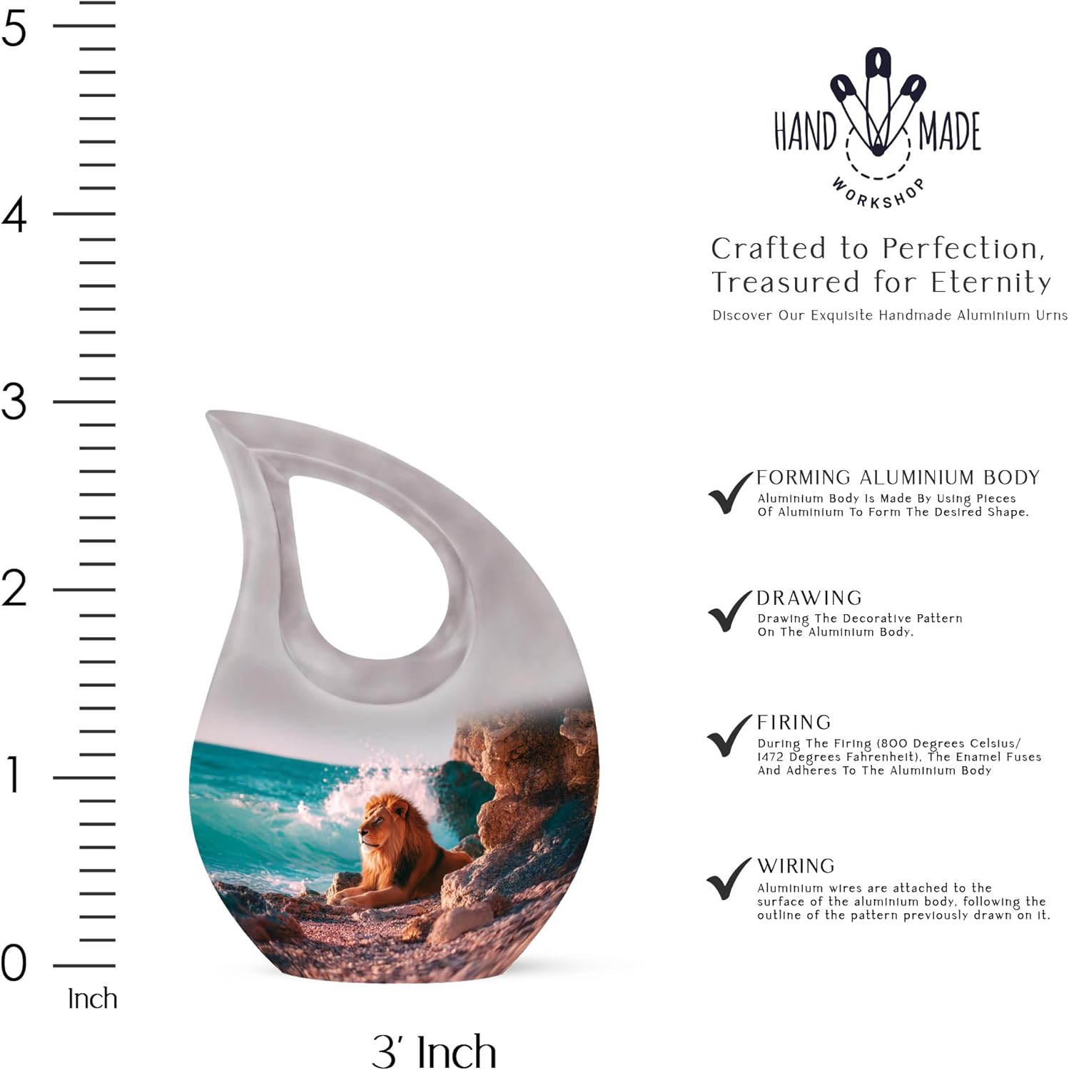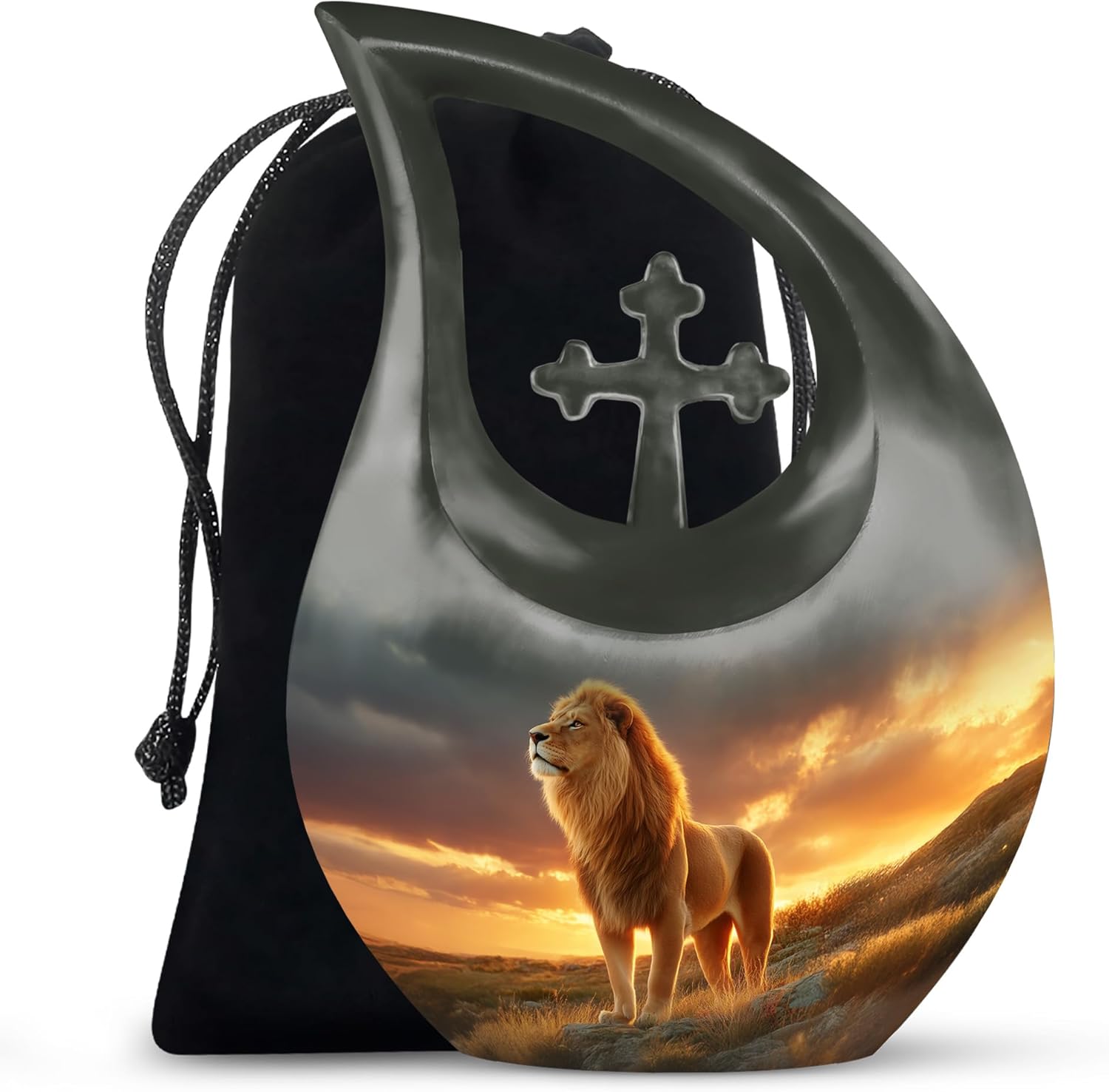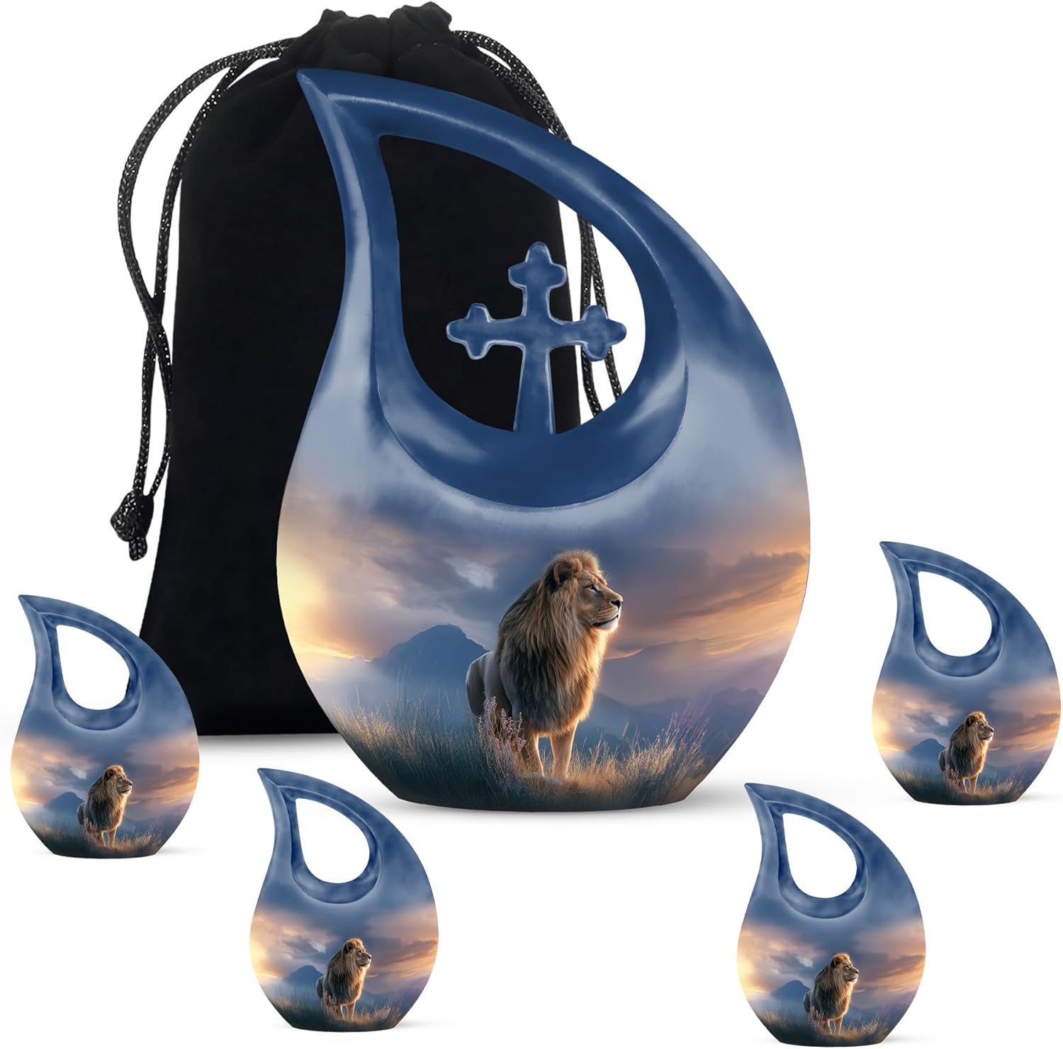 Introducing our lion combo burial memorial urn set, a majestic and meaningful way to honor the memory of a loved one with strength, courage, and dignity. This thoughtfully designed set includes 1 large urn and 4 matching keepsake urns, ideal for sharing ashes among family members or keeping a portion close. The large urn stands approximately 10 inches tall with a 200 cubic inch capacity, suitable for holding the full ashes of an average adult. The keepsake urns are each 3 inches tall and hold 3 cubic inches, perfect for holding a small portion of remains. All urns feature a lion design, symbolizing bravery, pride, and remembrance. Each urn includes a top-opening threaded lid for secure closure. The large urn comes with a velvet storage bag for protection and elegance, while the keepsake urns are safely packed in a presentation box, making them ideal for display or gifting. Whether used at home, in a service, or shared with family, this lion-themed urn set offers a powerful and respectful tribute to a life that left a lasting mark.