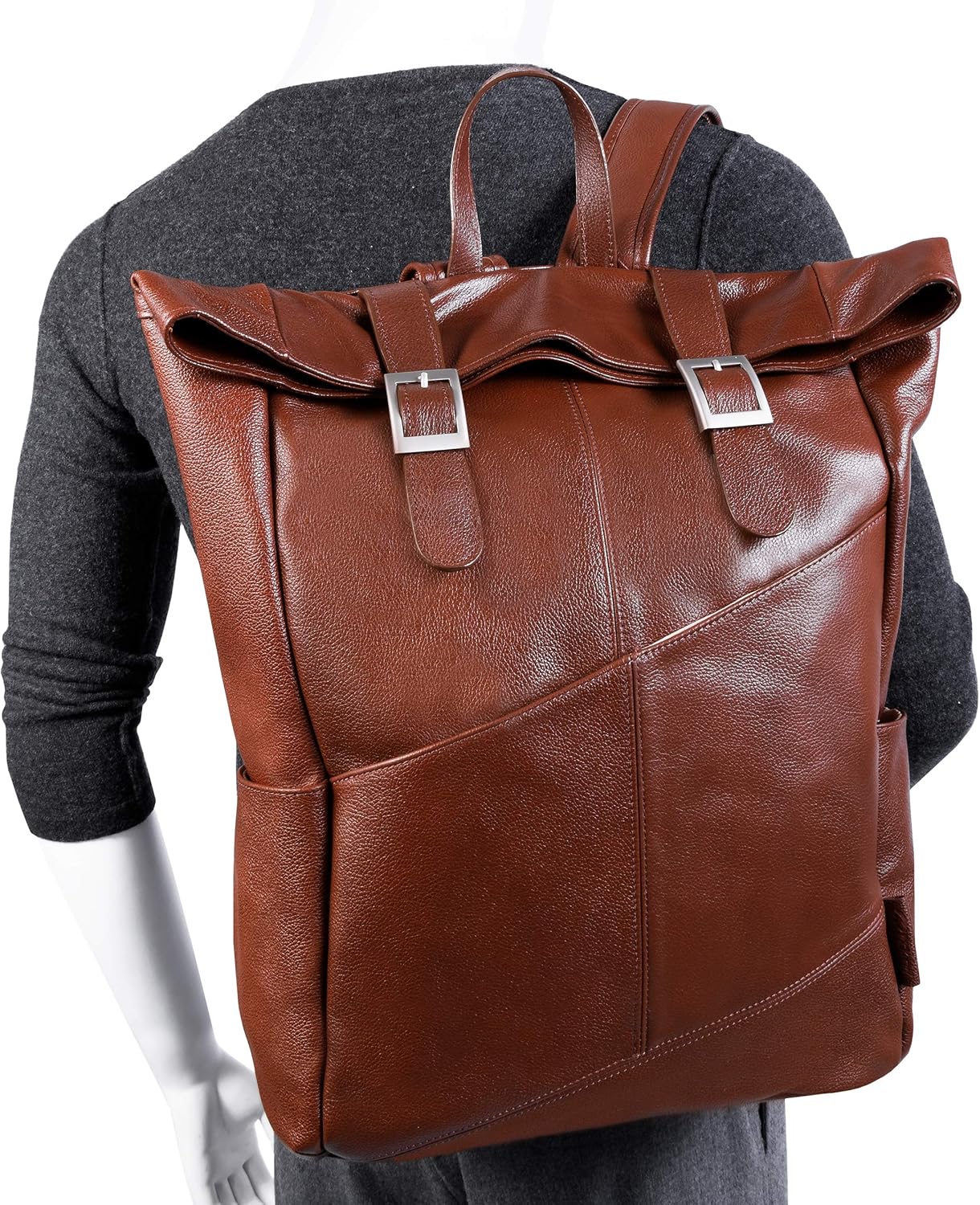 Leather Dual Access Laptop Backpack with flap slip lock closure. Front asymmetric pocket with two side pockets. Secured hidden side zipper pocket. Fully-lined interior with leather trim and silver accent hardware. Interior compartment features built-in laptop protection, tablet pocket and secured zipper pocket and organizer for business cards, pens, and accessories. Padded adjustable backpack straps. Padded mesh back with smart strap for piggy-backing onto rolling cases.