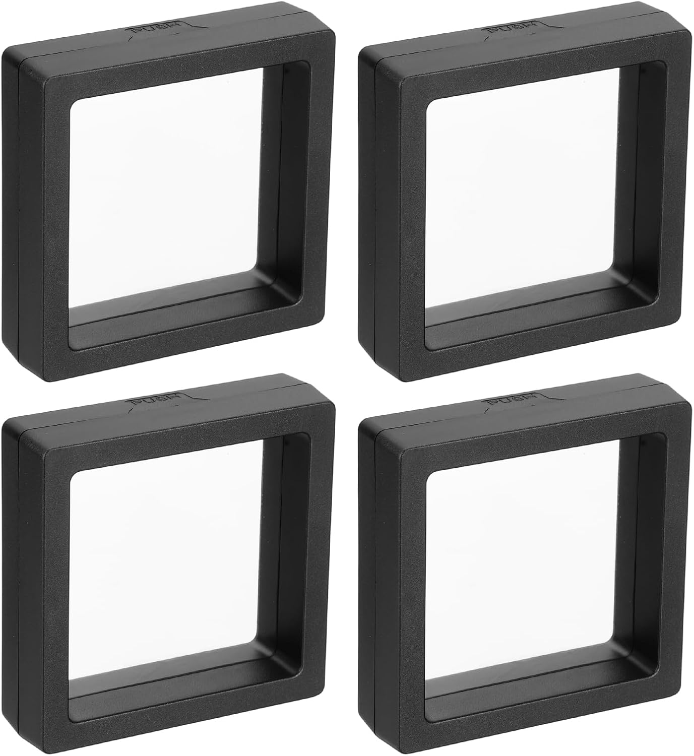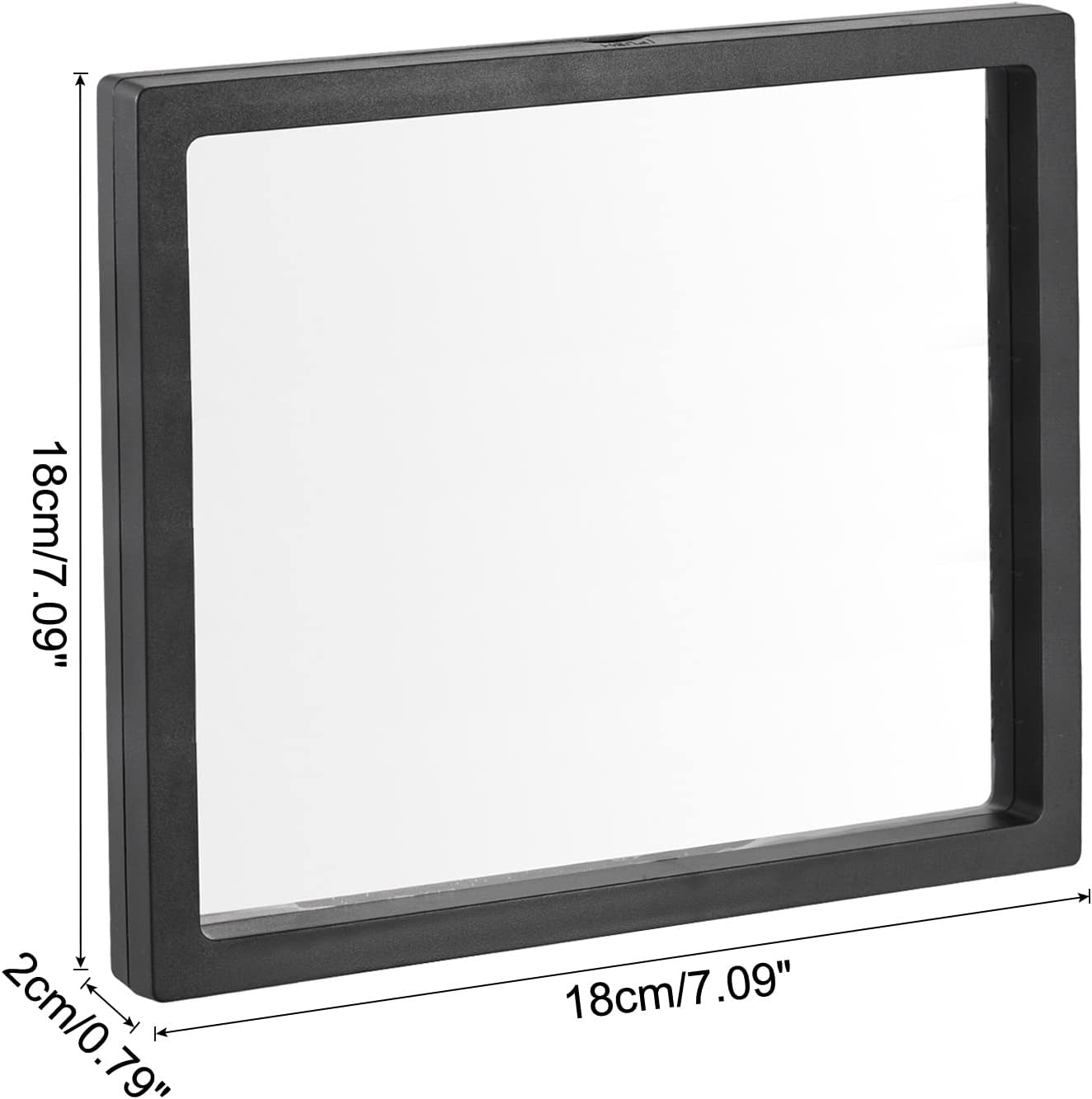 What is this?The display storage boxes are made of ABS frames and flexible TPU film, lightweight, durable, with great elasticity, and high transparency.What will I get?The display storage box, in size of: Size: 18cm x 18cm x 2cm/7.09 inch x 7.09 inch x 0.79 inch(L*W*H); Color: Black; Shape: SquareIn the package of 4 x display storage boxAre there any advantages of the product?The frame display case makes your jewelry float between two flexible transparent films, adding a 3D suspending effect. Sealed to prevent the jewelry from collisions and scratches. This display case is not only for ring necklace bracelet earrings, it can also be used for coins, stamps, etc.How to use it?Due to the clasp frame design, simply push and open the jewelry storage box, place objects between the clear film and adjust the position, close the box.What should I notice?All size is measured manually, please allow +/-0.1 inches error.