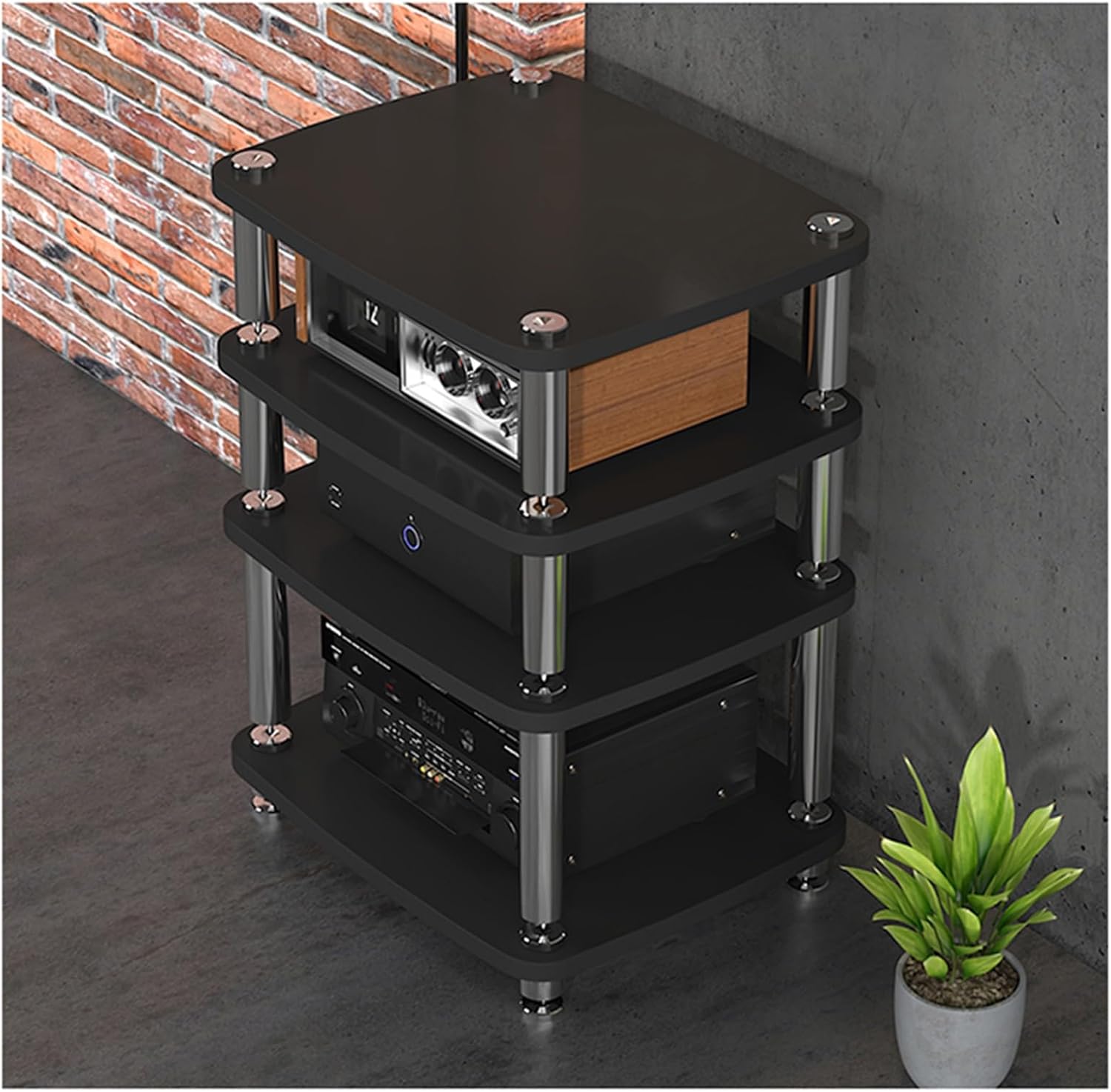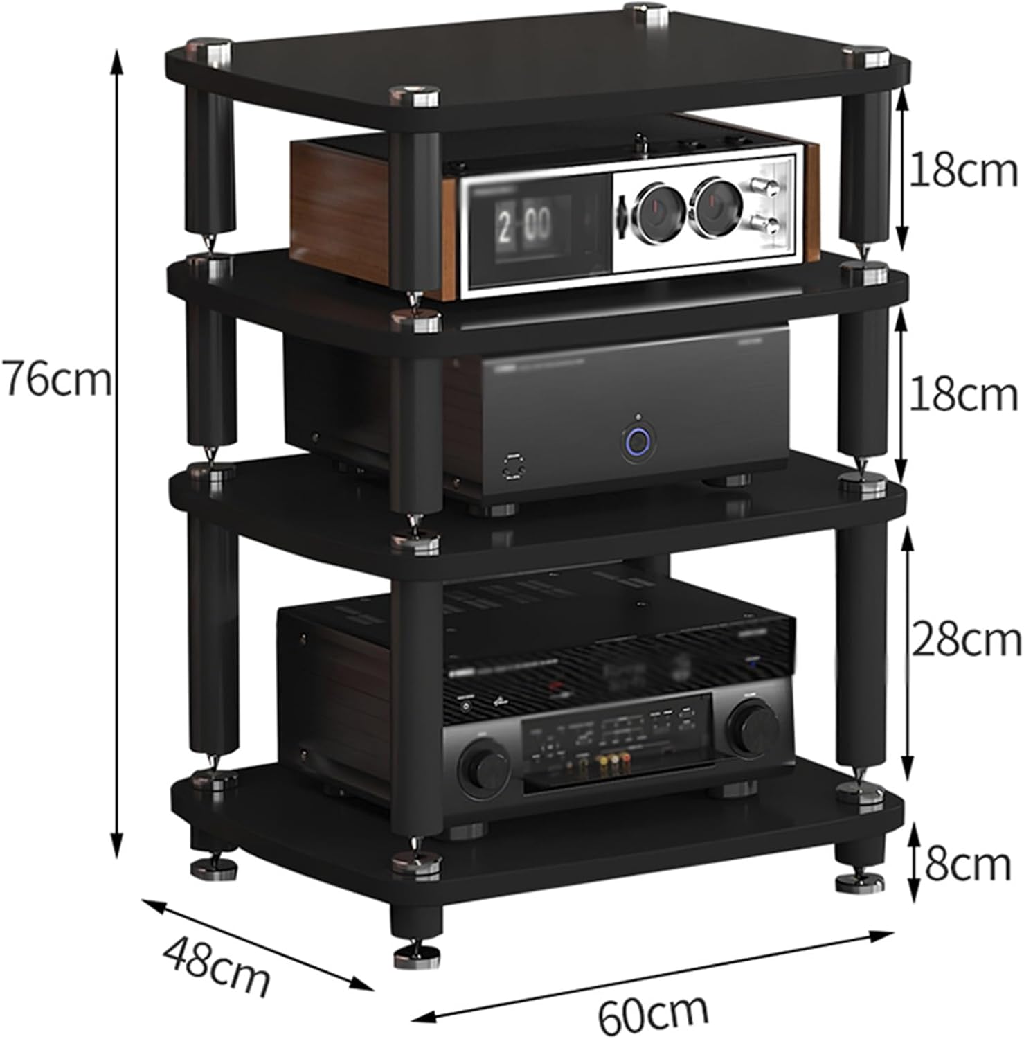 Looking for a modern media stand?Would you like to add an audio equipment storage rack to your home theater or meeting room?Take of our media racks home with you! This stereo audio stand is a stylish piece of furniture that will complement any room's decor.Specifications:Material: Pine board and silver stainless steel tubesNumber of layer: 4 tiersWhether To Assemble: YesApplicable scene: home / office / shop / theater/ bedroom / living room, etcPackage Includes:1 x media stand (Excludes items shown on pictures)