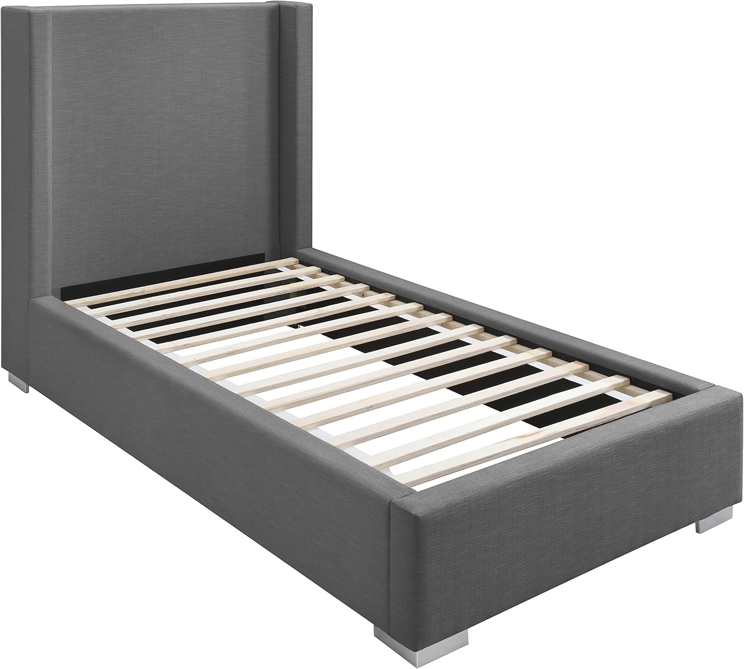 Make a big impression in the bedroom with this twin-size Royce linen textured bed. A wingback headboard is the star of the show here, with its extra height adding an element of drama to this exceptionally crafted bed. The headboard, sides and footboard of this Royce bed are covered in rich grey linen textured fabric for a sleek yet chic touch. The bed comes with both gold and chrome legs to suit your style preferences.
