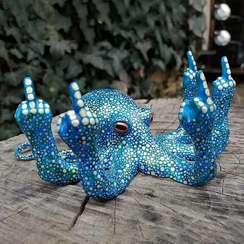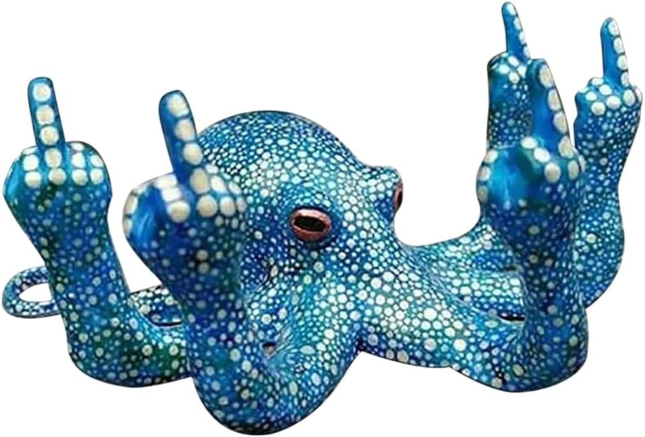 Anger octopus | creative decorative sculpture Product Details: Dimensions: Width: 4.73" (12cm), Height: 2.36" (6cm), Depth: 5.12" (13cm). Color: Blue*Black*Purple Material: PLA plastic Weight: 400g Package List: 1 octopus ornament This is a middle finger octopus. When you place the octopus, you always stare at the desk or mantel shelf. octopus figurine ornaments feature a rustic finish sea-inspired design that adds a nautical feel to your home or space. Baby octopus glows at night