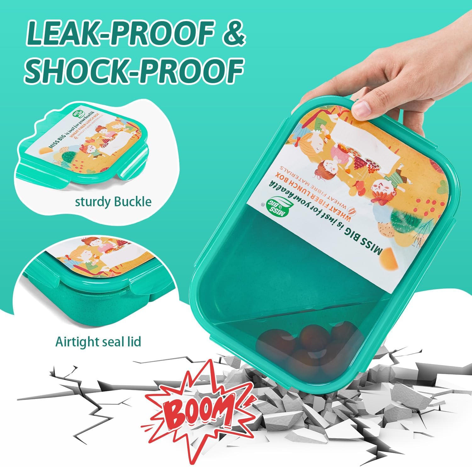 MISS BIG Bento Box, the Top Choice of Healthy Life! Product name: Lunch box for kids and adults Main product features: LEAK PROOF AND FOOD SEPERATED: Keeps meals and snacks fresh and mess-free during transport– Includes four kid-friendly latches that are easy for small hands to open and close. IDEAL BENTO LUNCH BOXES FOR KIDS: The upgraded 3 practical compartments portioned perfectly for a kid even adults’ appetite to encourage a healthy and balanced meal. MICROWAVE AND DISHWASHER SAFE: Remove the lid while reheating food in the microwave and cleans up easily in the dishwasher. SAFETY KIDS LUNCH BOX: The main raw material is natural wheat fiber making it healthy for our planet and for our children. No BPAs and no chemical dyes. PORTABLE LUNCH BOX: Which can hold enough food and is easy to carry. You can easily put it in your bag without worrying about food leaking, so you can enjoy your food anywhere. Product size: 8.66*5.9*2.2in