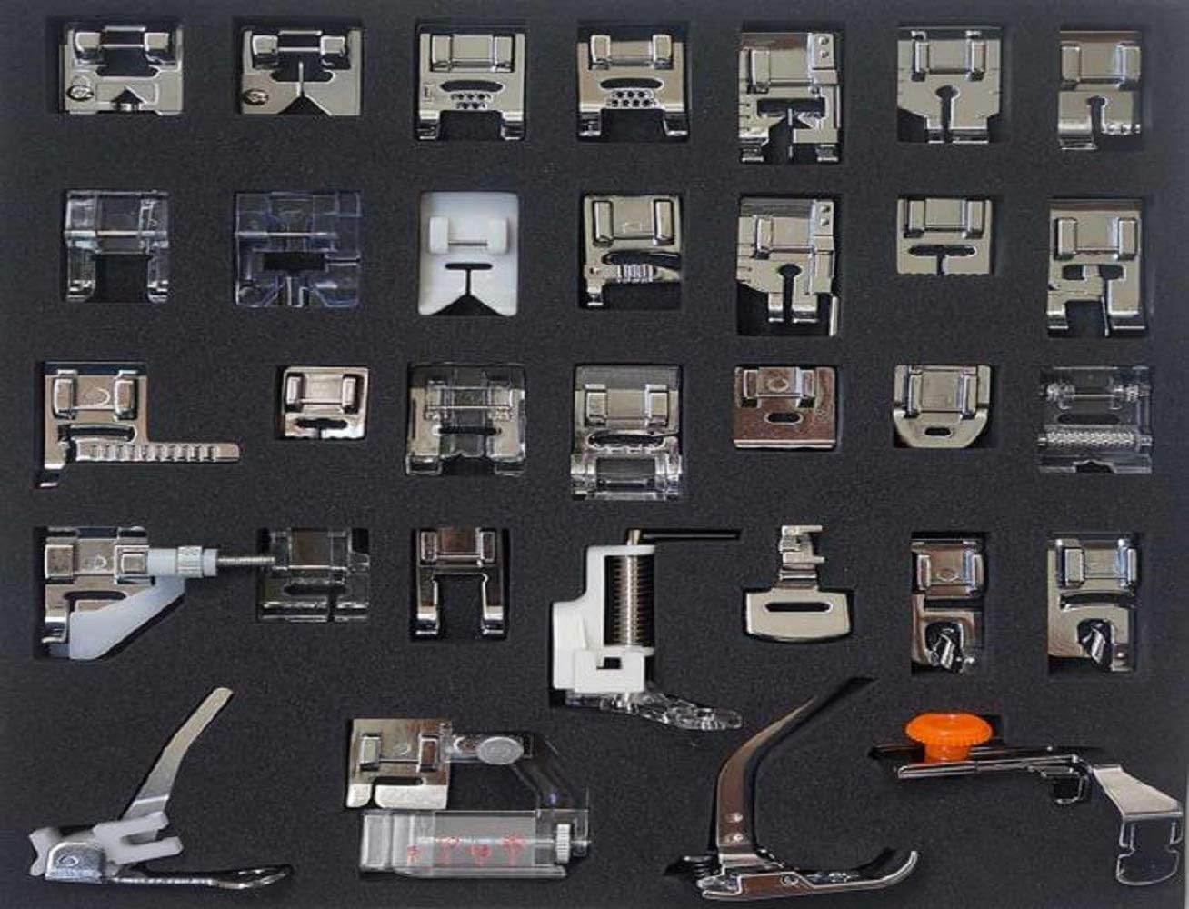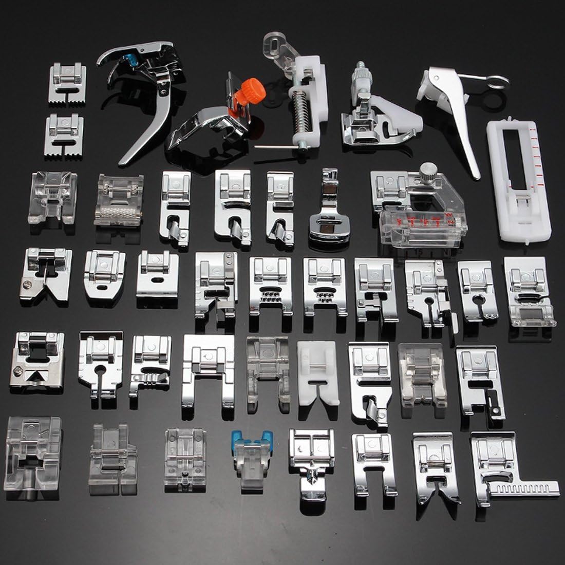 42 Pcs Presser Foot Feet Kit Sewing knitting Crochet Hooks Domestic Machine Stitch Darning Presser Foot Feet For Brother Singer Very popular and different presser feet for most of household multi-functional sewing machines with a low shank, such as Singer, Baby Lock, Brother, Janome, etc. Package includes 42 pieces of feet, the listing as below: A: 1. Stitch Guide Foot; 2. Universal Presser Foot; 3. Open Toe Foot; 4.Zipper Foot; 5. Nail Button Pressing Foot; 6. Plastic Invisible Zipper Presser Foot; 7. Applique Foot; 8.Round Bead Foot B: 1. Sewing Presser Foot; 2. Stain Stitch Foot; 3. 6mm Roll of Lace Presser Foot; 4. Zig Zag Foot; 5. Open Toe Embroidery Foot; 6. Large Opening Presser Foot; 7. Cording Foot; 8. 1/4" Quilting Foot 9. Braiding Foot; C: 1. Standard Presser Foot; 2. Straight Stitch Foot ; 3. 1/4" Quilting Foot; 4. Overcast Foot; 5. Hole Cording Foot; 6. Edge Joining Foot; 7. Double Welting Foot; 8.Invisible Zipper Presser Foot; 9.Fringe Foot D: 1. Adjustable Bias Tape Binder Foot; 2. Shirring Foot; 3. 3mm Narrow Edge Presser Foot; 4. 6mm Wide Edge Presser Foot; 5. 3mm Roll of Lace Presser Foot; 6. Roller Foot; 7. Sewing Beads Presser Foot E: 1. Buttonholing Presser Foot; 2. Darning Foot,Low Shank; 3. Blind Stitch Foot; 4. Darning Foot; 5. Zipper Foot,Low Shank; 6.Kint Foot; 7. 7-Groove Pintuck Foot; 8. 9-Groove Pintuck Foot Package:1 X Set(42pcs) of Sewing Machine Foot