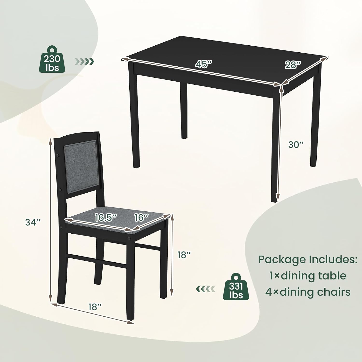 | Included Components | 1 X dining table, 4 X dining chairs |