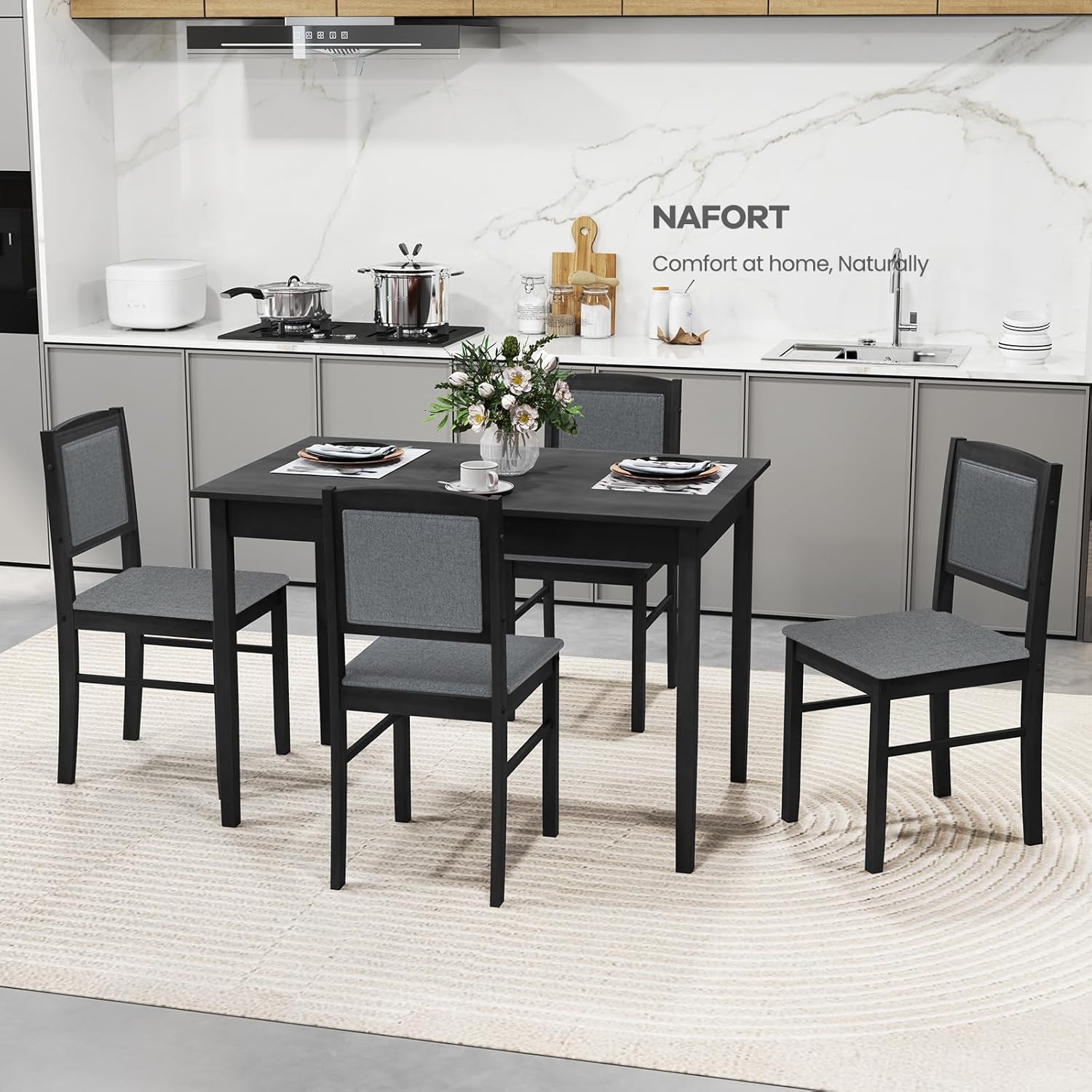 NAFORT Kitchen Table Set for 4, Mid-Century Modern Dining Table and Chairs Set of 4, Farmhouse Dinner Set w/ 4 Upholstered Chairs, Rubber Wood Dinette Set for Kitchen& Dining Room, Restaurant