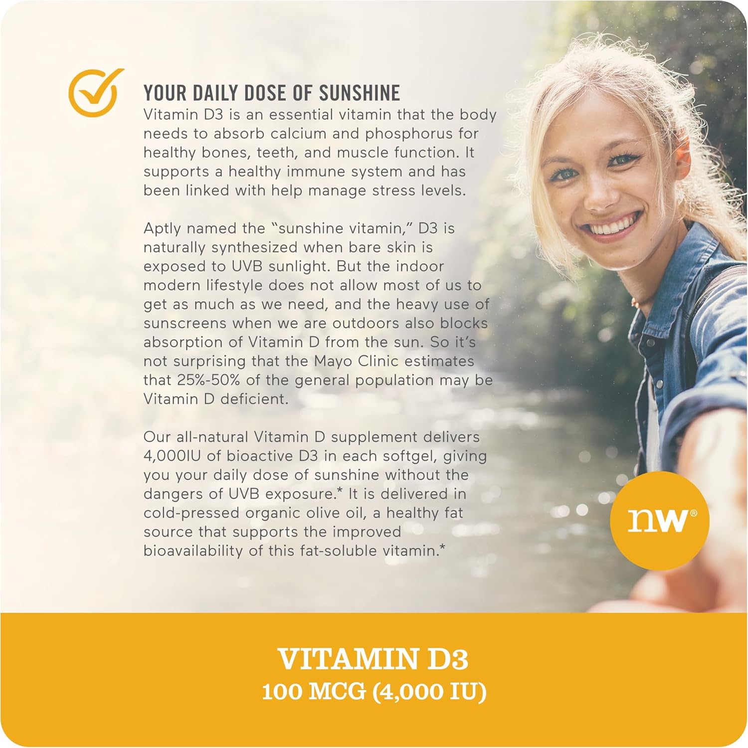 Get your daily dose of vitamin D with this bundle of NatureWise vitamin D3 supplements. It includes 360 count bottles of both 4000iu and 2000iu strengths to help support healthy bones, teeth, muscle function and immune health. Both supplements provide vitamin D3, which is the same biologically active form that your body naturally produces through sun exposure. Since many people do not get enough vitamin D from the sun alone, these supplements offer a convenient way to get your essential daily intake. The 4000iu softgels provide a higher strength dose in one small, easy-to-swallow mini softgel. The 2000iu option allows you to customize your dosage depending on your individual needs. Both feature vitamin D3 suspended in certified organic olive oil, which studies show helps maximize absorption of this fat-soluble nutrient. With one bottle for higher potency and one for flexibility, this bundle makes it easy to maintain optimal vitamin D levels. Support your overall health and wellbeing with the power of vitamin D from the sun in a safe, pure and natural supplement form.
