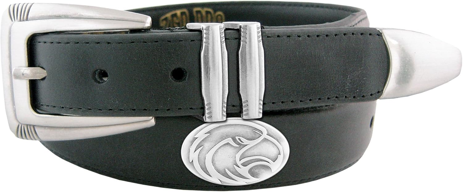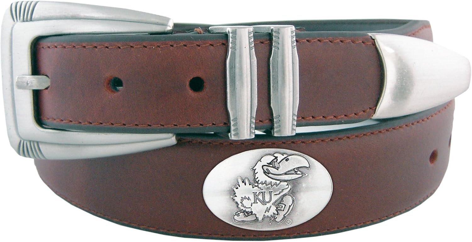 Show off your Arkansas Razorbacks college team spirit with this official NCAA licensed dressy leather belt. A subtle way to support your team while accessorizing any dress attire. This brown genuine oil-tanned leather belt features an ornate silver gun metal buckle, keeper, tip and tapered ends and is embellished with four silver gunmetal Conchos on the belt. Fits slacks that have a minimum loop size of 1.25-Inch. Belt size is one size larger than pant size.