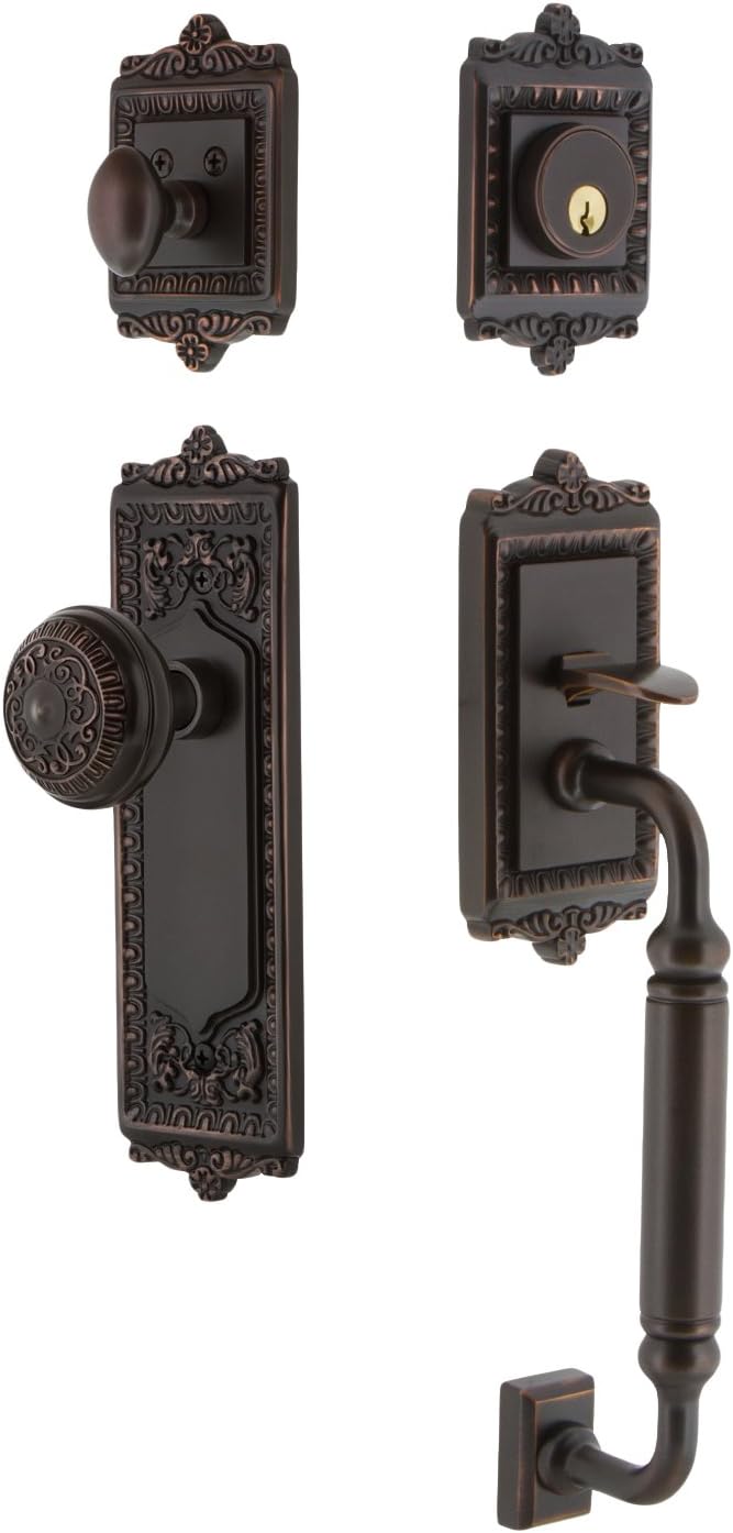 With its distinctive repeating border detail, as well as floral crown and foot, the egg & dart exterior handle set resonates grand style. All Nostalgic Warehouse handle sets are mounted on a solid (not plated) forged brass base for durability and beauty.