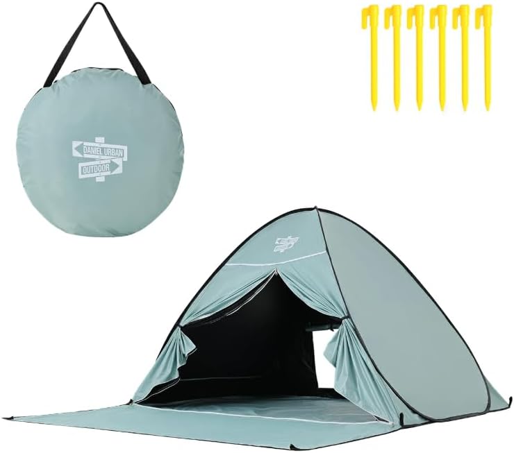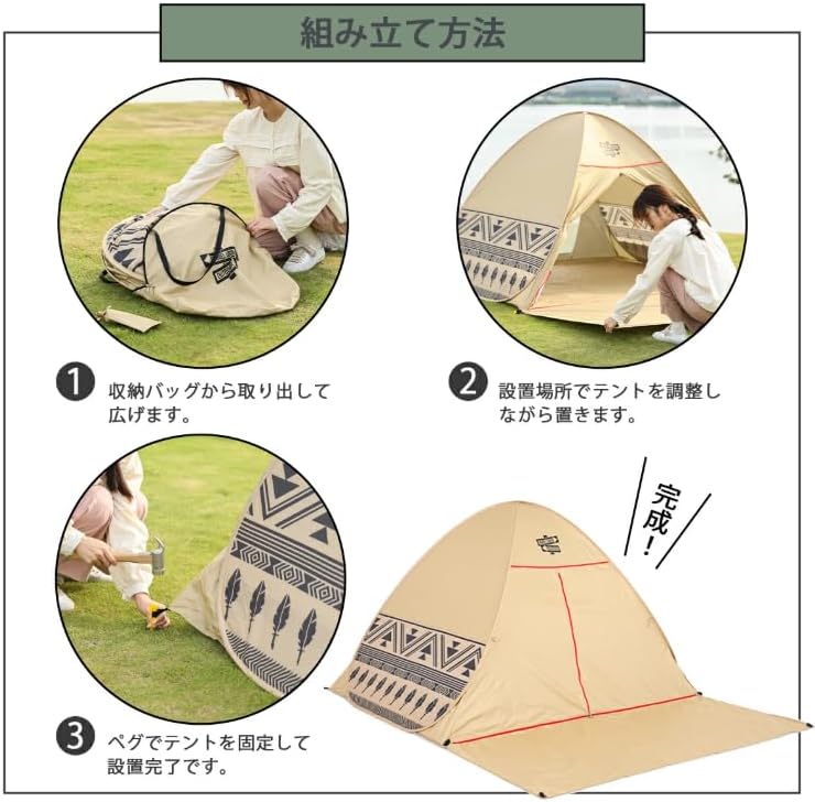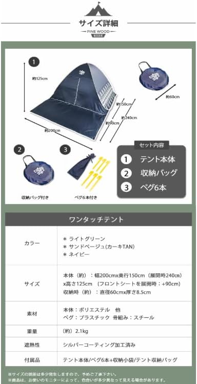 ◆Colors & Patterns: Sand Beige (Khaki Tan), ◆Finishing: UV-resistant, Silver Coating, Water-Repellent ◆Size: When set up: Approx. 200cm W x 150cm D (240cm Folded) x 125cm H; When stored: Approx. 60cm Diameter x 8.5cm Thick ◆Set Contents: Tent Storage Bag 6 Pegs ◆Weight: Approx. 2.1kg ◆Capacity: 3-4 people