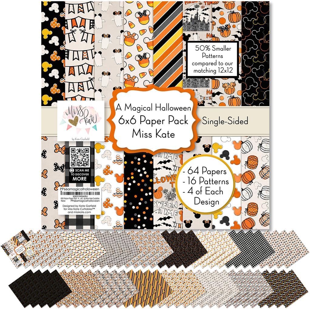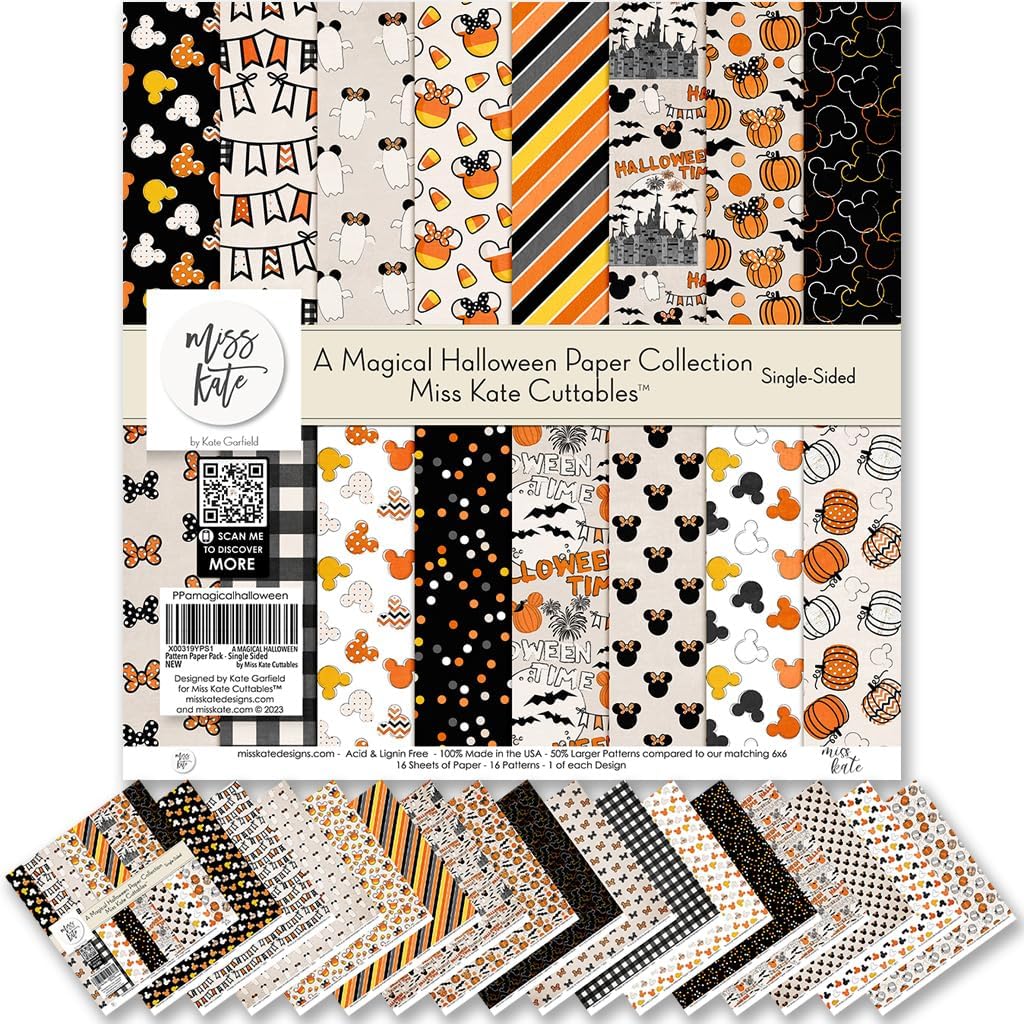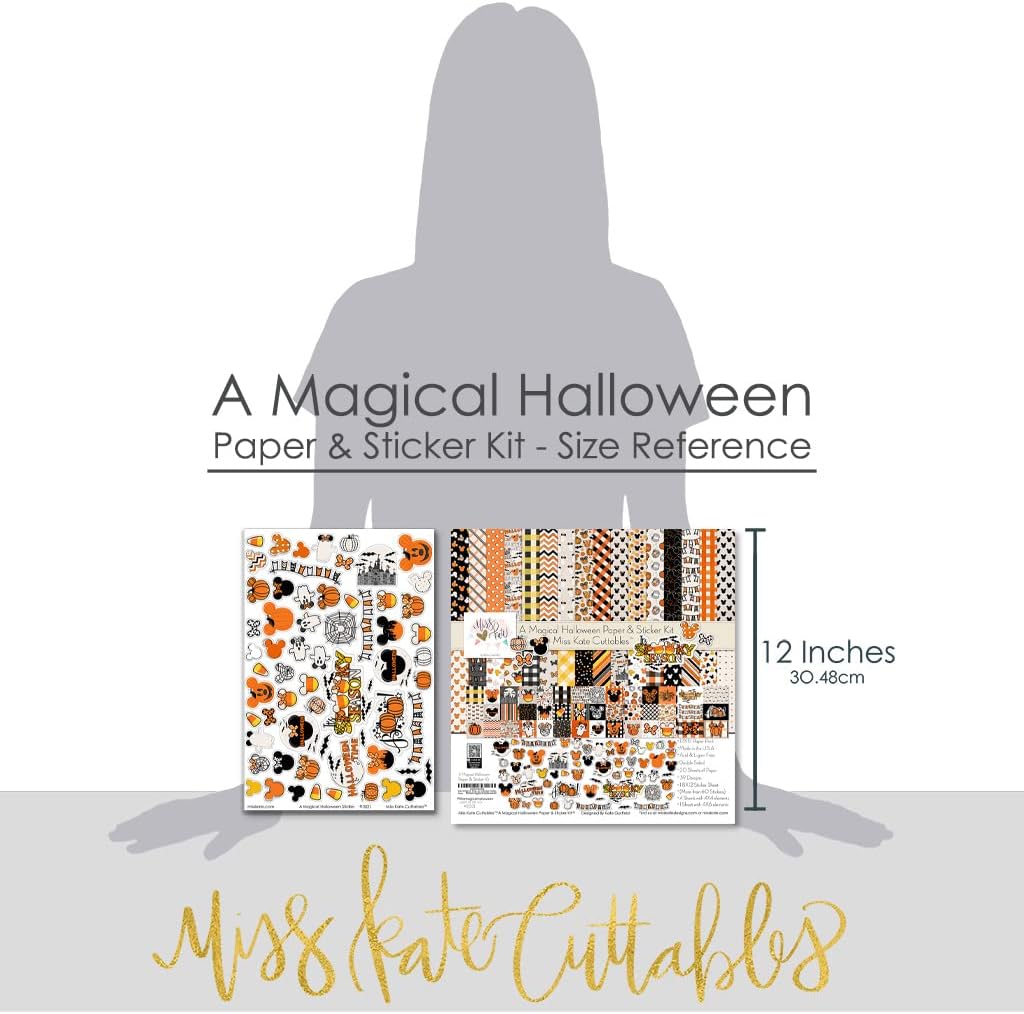 Miss Kate's Paper & Sticker Kit For Scrapbookers, Card Makers, & CraftersAre you always on the lookout for new supplies with cute designs?Then look no further because we’ve got you covered!The Miss Kate Cuttables Paper & Sticker Kit is exactly what you need!About Out PaperWe get lots of questions and comments about the type of paper Kate chooses to print Miss Kate's paper on.Our Bristol sheets provide a stiff, strong surface to work on that is silky smooth to the touch. It is not cardstock and it is not thin paper. The printing has a slight gloss to give it some dimension. We love our paper and think you will too!Paper & Sticker Kit DescriptionA Magical Halloween Double Sided Paper has a wide variety of patterns including polka dots, plaid, stripes, Candy Corn, Castle, Ric Rac, Stars, Bats, Pumpkins, Works with for Mickey Ears, Mickey Ghost, Minnie Ears, vacation, castle, princess, amusement park, and theme park.A Magical Halloween Paper Sticker Sheet has a wide variety of designs, including Castle, Candy Corn, Mickey and Minnie Candy Corn, Bats, Mickey and Minnie Ghosts, Minnie Bows, Mickey and Minnie Pumpkins.THEME:Works for Halloween Time at Disney, Disney Halloween, Mickey Ears, Mickey Ghost, Minnie Ears, vacation, castle, princess, amusement park, and theme park.✔ 80lb Premium Specialty Paper✔ 17 - 12"x12" sheets of DOUBLE-SIDED paper✔ 33 Designs✔ 1 - 8"x12" Sticker Sheet✔ Acid and Lignin Free (our paper will NOT damage other things)✔ Archival Quality (beautiful colorful prints that will never fade)