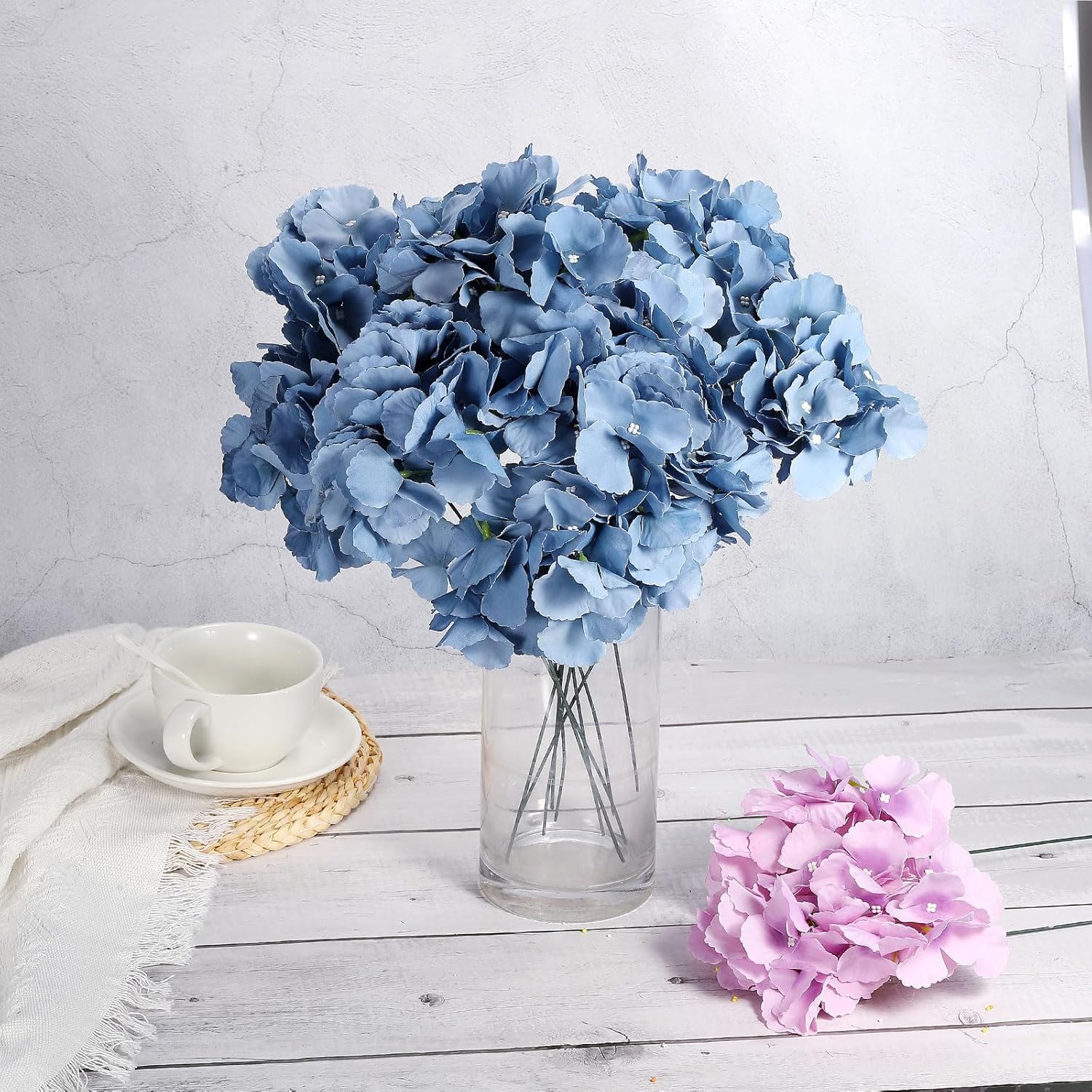 Artificial hydrangea flowers add a touch of beauty and elegance to occasions such as weddings, birthdays, parties, and home decor. They are particularly suitable for wedding decorations, tabletop centerpieces, bouquet arrangements, and more.SpecificationColor: Grey BlueMaterial: Plastic, SilkTotal Height: 40cm / 15.7 inchStem Length: 12cm / 4.7 inchFlower Diameter: 15cm / 5.9 inchPacking List: 10Pcs x Artificial Hydrangea Heads with StemsAdvantageThe faux hydrangea heads with stems are made of silk and plastic, crafted with precision for a beautiful appearance and come in elegant and vibrant colors. Each hydrangea flower head has 27 petals, which are full and lifelike. The leaf textures are clear, and the flowers can be reused and have a long service time without worrying about wilting.InstructionThe flower stems are detachable, allowing you to use and cut them according to your needs.NOTE: Due to the difference in natural light and display resolution, the item color displayed in photos may be slightly different from the real object.