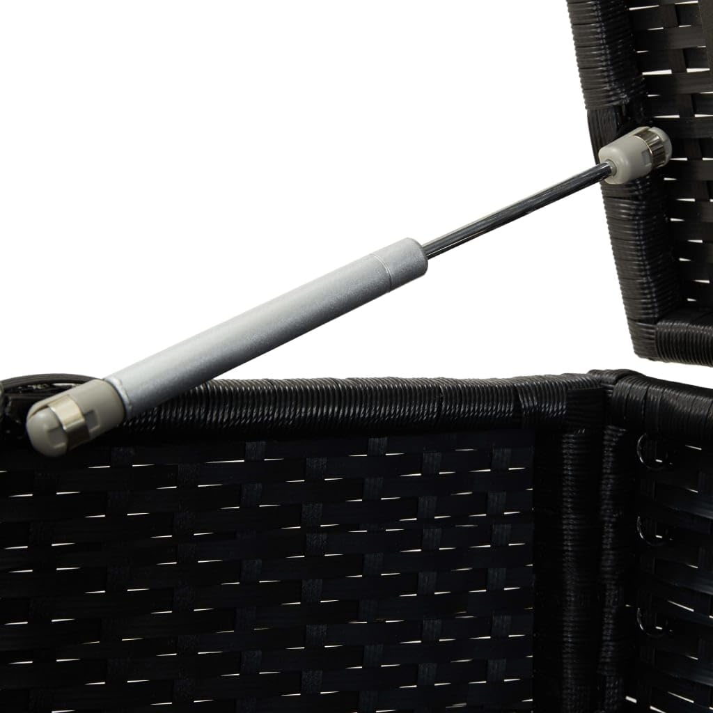 This durable poly rattan patio storage box will make a practical as well as decorative addition to your outdoor or indoor living space. The storage chest has a PE liner with zipped closure.Ample storage space: Designed with a spacious trunk, it is big enough to store garden items like furniture cushions, pillows, extra blankets, and gardening supplies.Durable material: This storage box is constructed from a powder-coated steel frame and hand-woven poly rattan, which is durable, anti-rust, and weather-resistant for years of reliable use. It is also easy to clean with a damp cloth.PE liner: The liner with zipped closure will protect the contents from dust and moisture.High feet: Thanks to the elevated feet, this storage box ensures good air circulation underneath and keeps essentials dry and clean.Good to know:Please cover the pillow box with waterproof cloth/material to prevent rain from entering the box if it rains.Color: BlackMaterial: PE (polyethylene) rattan + powder-coated steel frameDimensions: 39.4" x 19.7" x 19.7" (W x D x H)Inner dimensions: 37.8" x 18.1" x 16.1" (W x D x H)PE liner with zipped closureMoisture proof with elevated feetWith gas lift mechanism for easy opening and closing