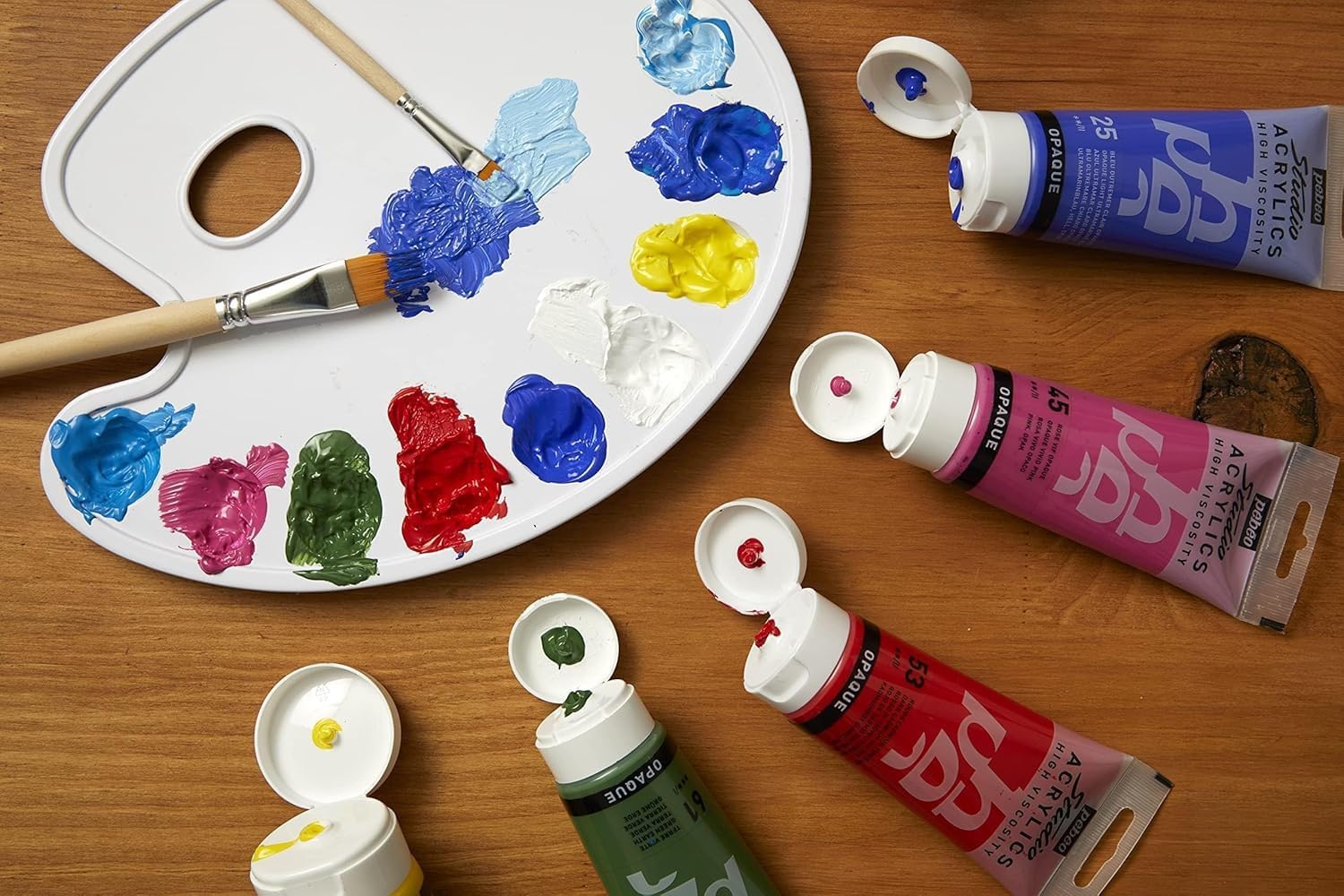 Studio Acrylics High Viscosity is a fine acrylic offering vivid and deep, richly pigmented colors with a matt, satin finish. Its thick consistency is particularly suited to work in dimension. When applied in thickness, colors retain the imprint of the brush stroke or painting knife. They can be used alone, mixed together, or combined with Studio Acrylics mediums depending on the desired effect. Very adherent and indelible once dry, Studio Acrylics is suitable for most surfaces and ideal for Mixed Media techniques and working in layers. Dry applications offer a permanent and flexible paint film, with good lightfastness. Studio Acrylics High Viscosity is available in 100 ml tubes in 62 colors, of which 5 Metallic, 7 Dyna, and 3 Fluo colors. In addition, 50 selected colors are offered in 250 ml tubes and 59 selected colors are offered in 500 ml jars. AP certified.